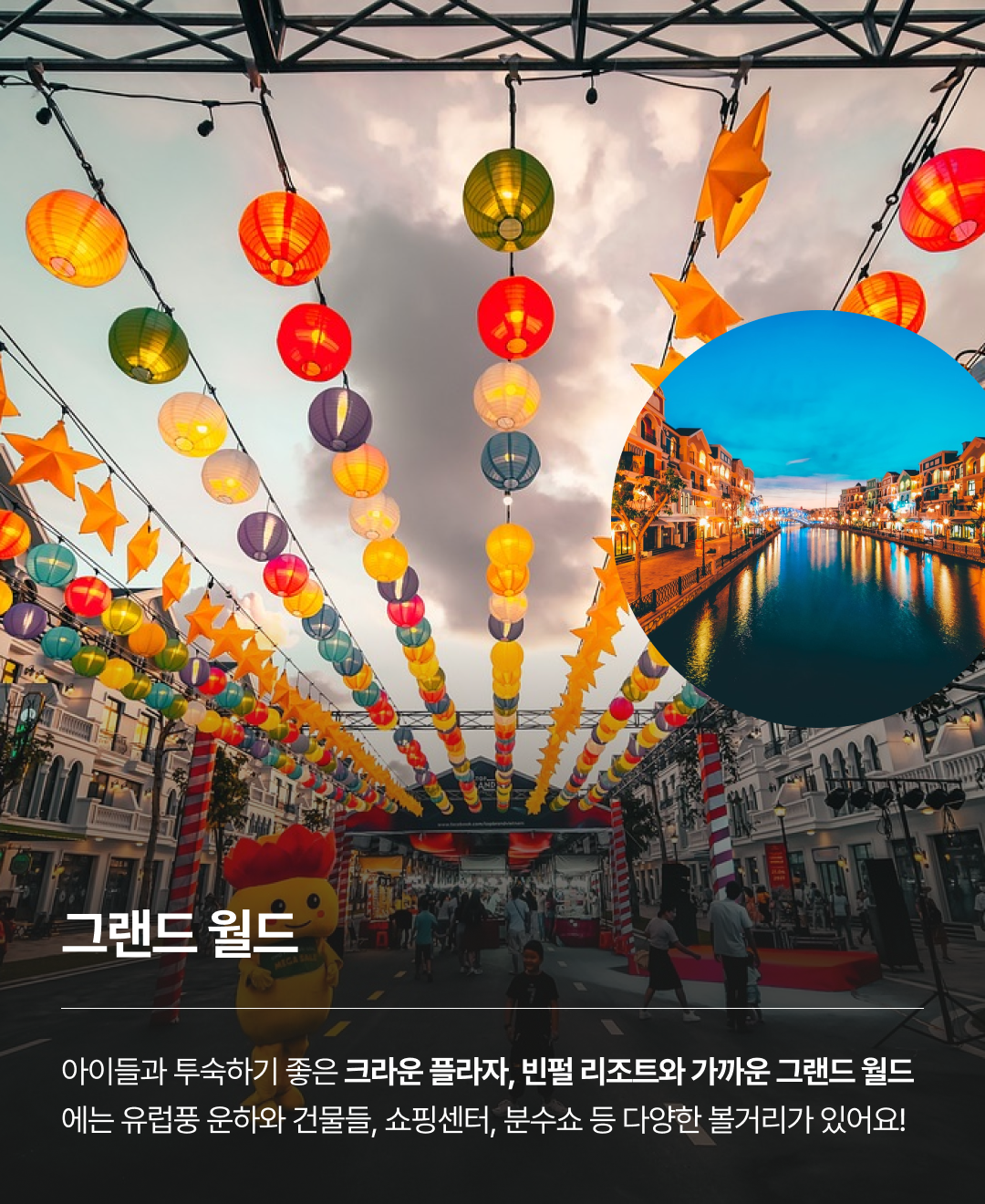 아이들과 투숙하기 좋은 크라운 플라자, 빈펄 리조트와 가까운 그랜드 월드에는 유럽풍 운하와 건물들, 쇼핑센터, 분수쇼 등 다양한 볼거리가 있어요!