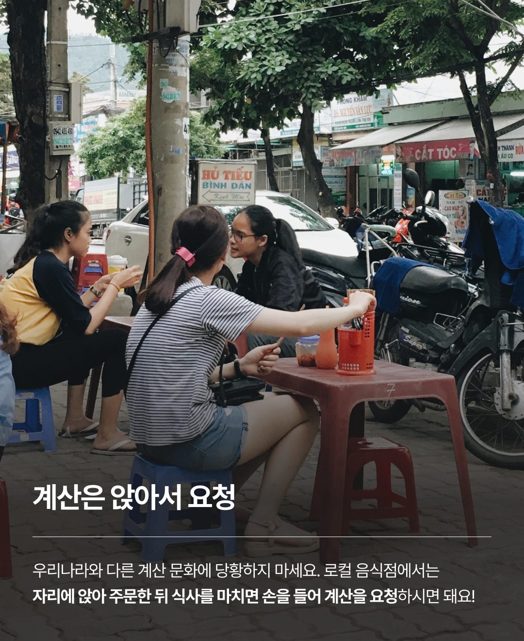 우리나라와 다른 계산 문화에 당황하지 마세요. 로컬 음식점에서는 자리에 앉아 주문한 뒤 식사를 마치면 손을 들어 계산을 요청하시면 돼요!