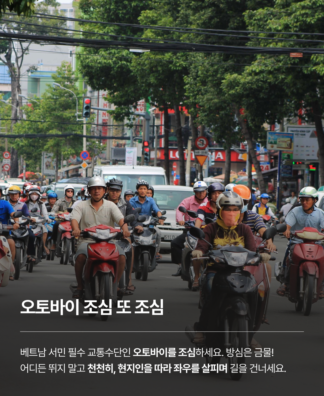 베트남 서민 필수 교통수단인 오토바이를 조심하세요. 방심은 금물! 어디든 뛰지 말고 천천히, 현지인을 따라 좌우를 살피며 길을 건너세요.