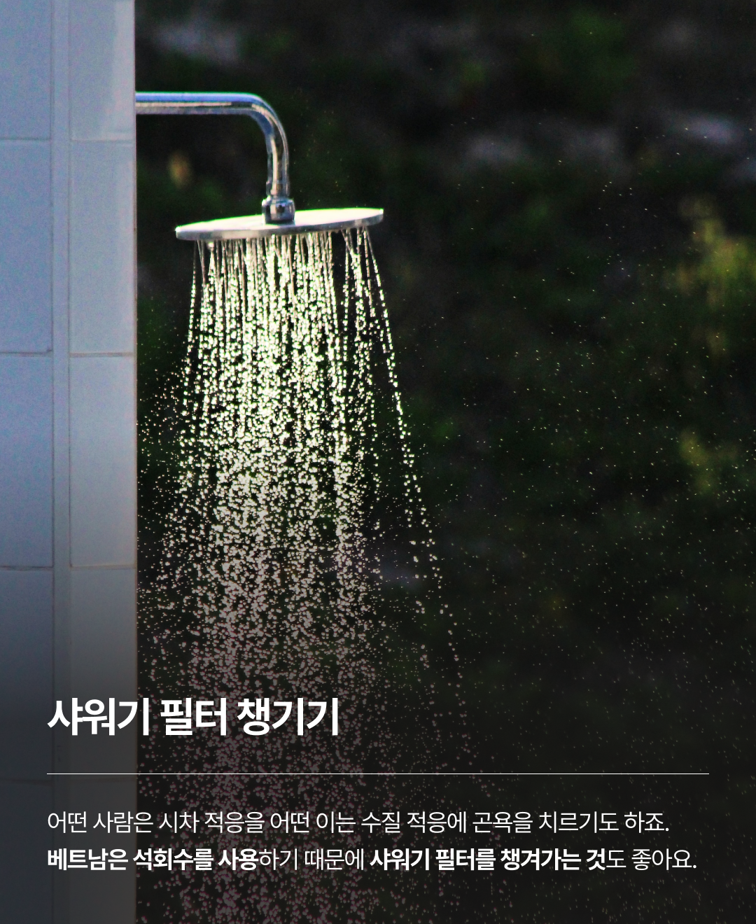 어떤 사람은 시차 적응을 어떤 이는 수질 적응에 곤욕을 치르기도 하죠. 베트남은 석회수를 사용하기 때문에 샤워기 필터를 챙겨가는 것도 좋아요.