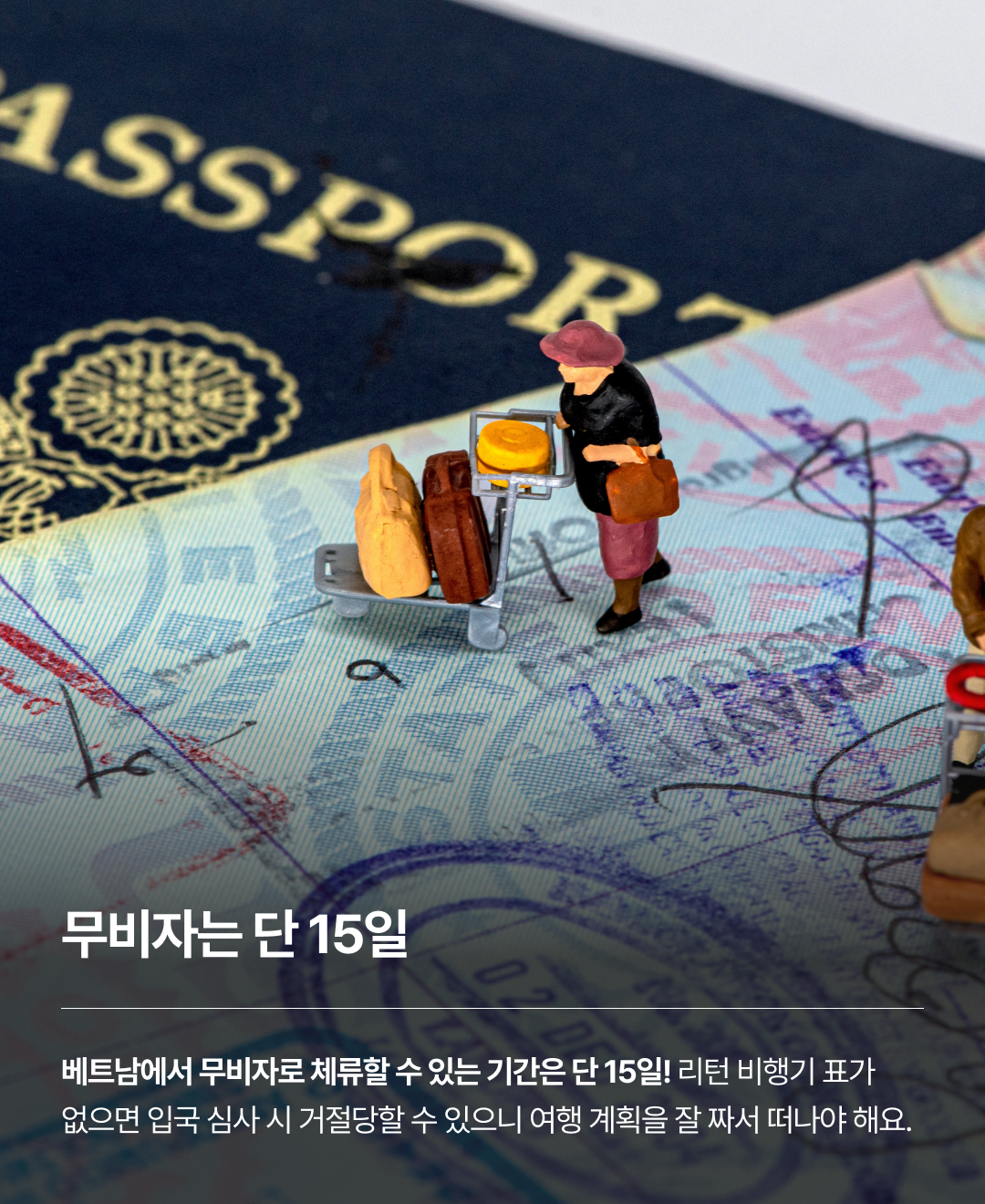 베트남에서 무비자로 체류할 수 있는 기간은 단 15일! 리턴 비행기 표가 없으면 입국 심사 시 거절당할 수 있으니 여행 계획을 잘 짜서 떠나야 해요.