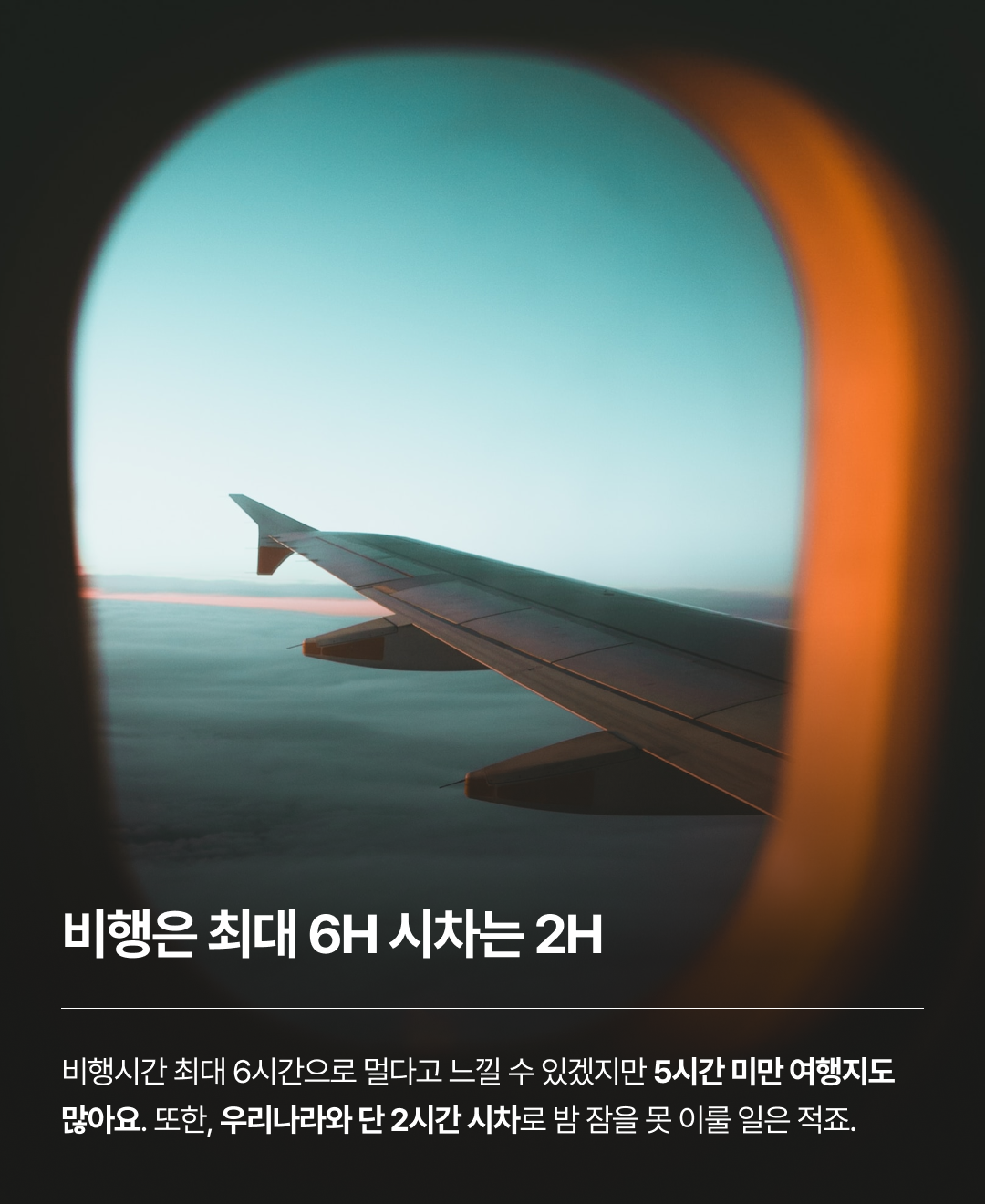 비행시간 최대 6시간으로 멀다고 느낄 수 있겠지만 5시간 미만 여행지도 많아요. 또한, 우리나라와 단 2시간 시차로 밤 잠을 못 이룰 일은 적죠.