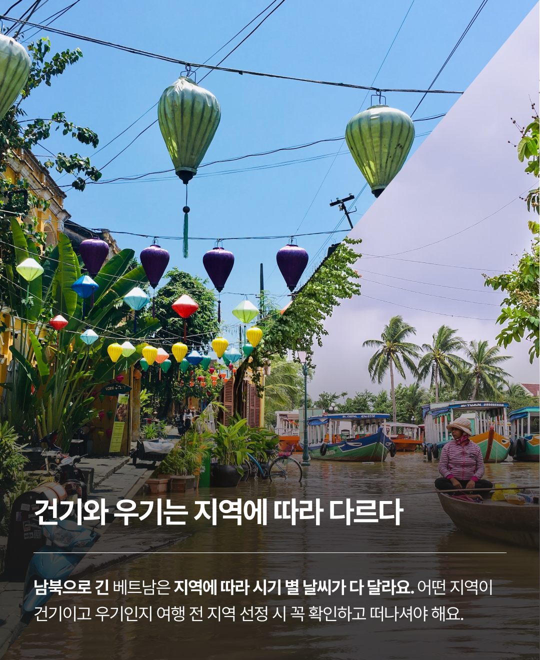 남북으로 긴 베트남은 지역에 따라 시기 별 날씨가 다 달라요. 어떤 지역이 건기이고 우기인지 여행 전 지역 선정 시 꼭 확인하고 떠나셔야 해요.