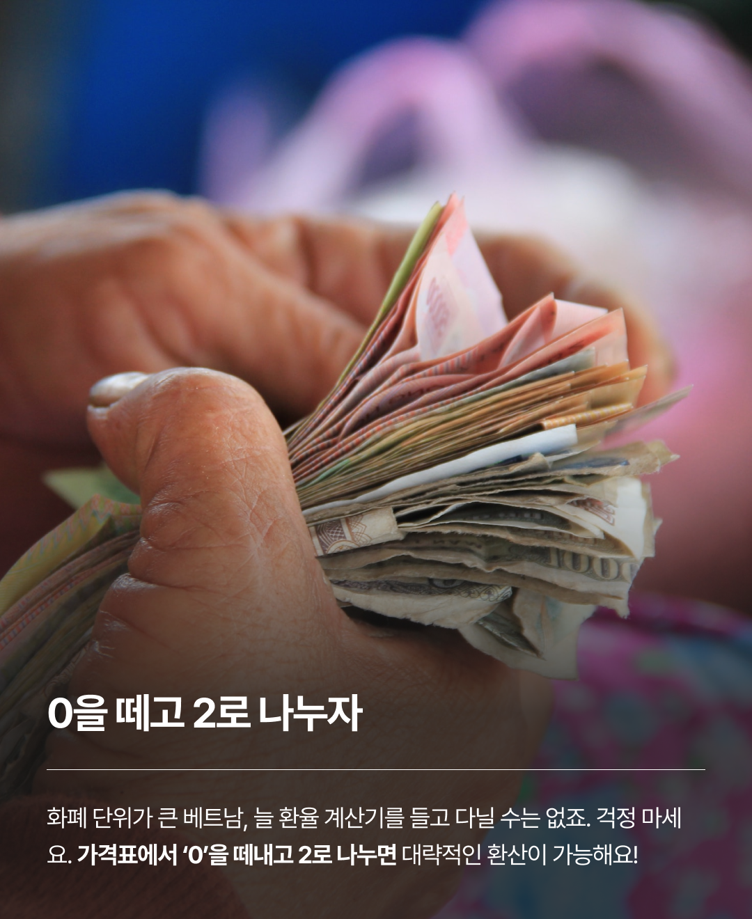 화폐 단위가 큰 베트남, 늘 환율 계산기를 들고 다닐 수는 없죠. 걱정 마세요. 가격표에서 ‘0’을 떼내고 2로 나누면 대략적인 환산이 가능해요!