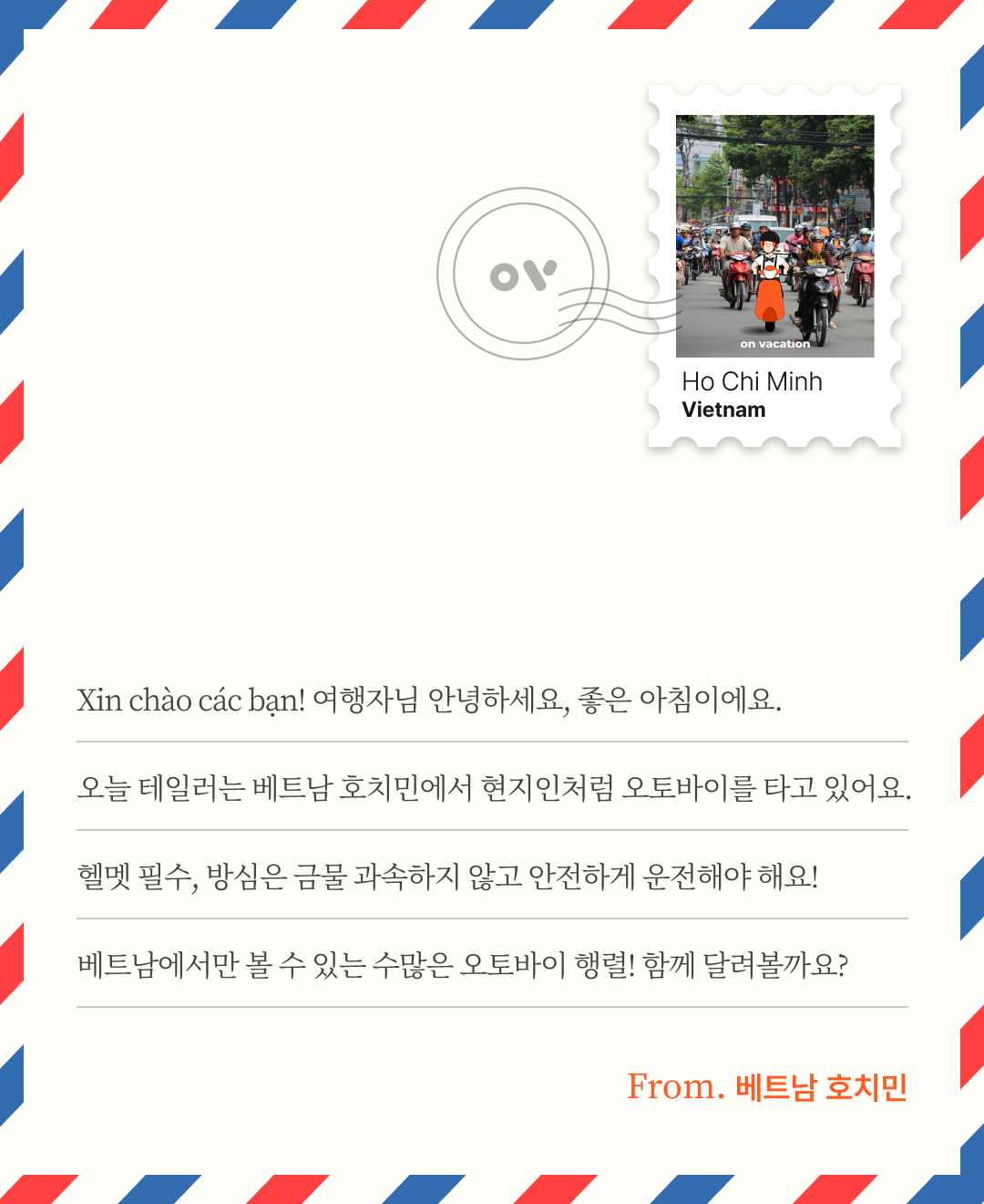오늘 테일러는 베트남 호치민에서 현지인처럼 오토바이를 타고 있어요.