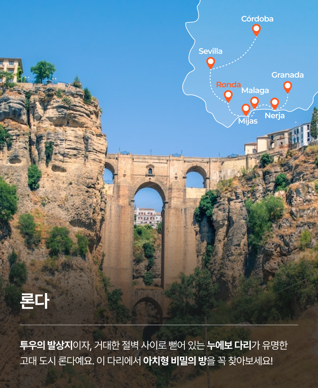 뻗어 있는 누에보 다리가 유명한 고대 도시 론다예요.