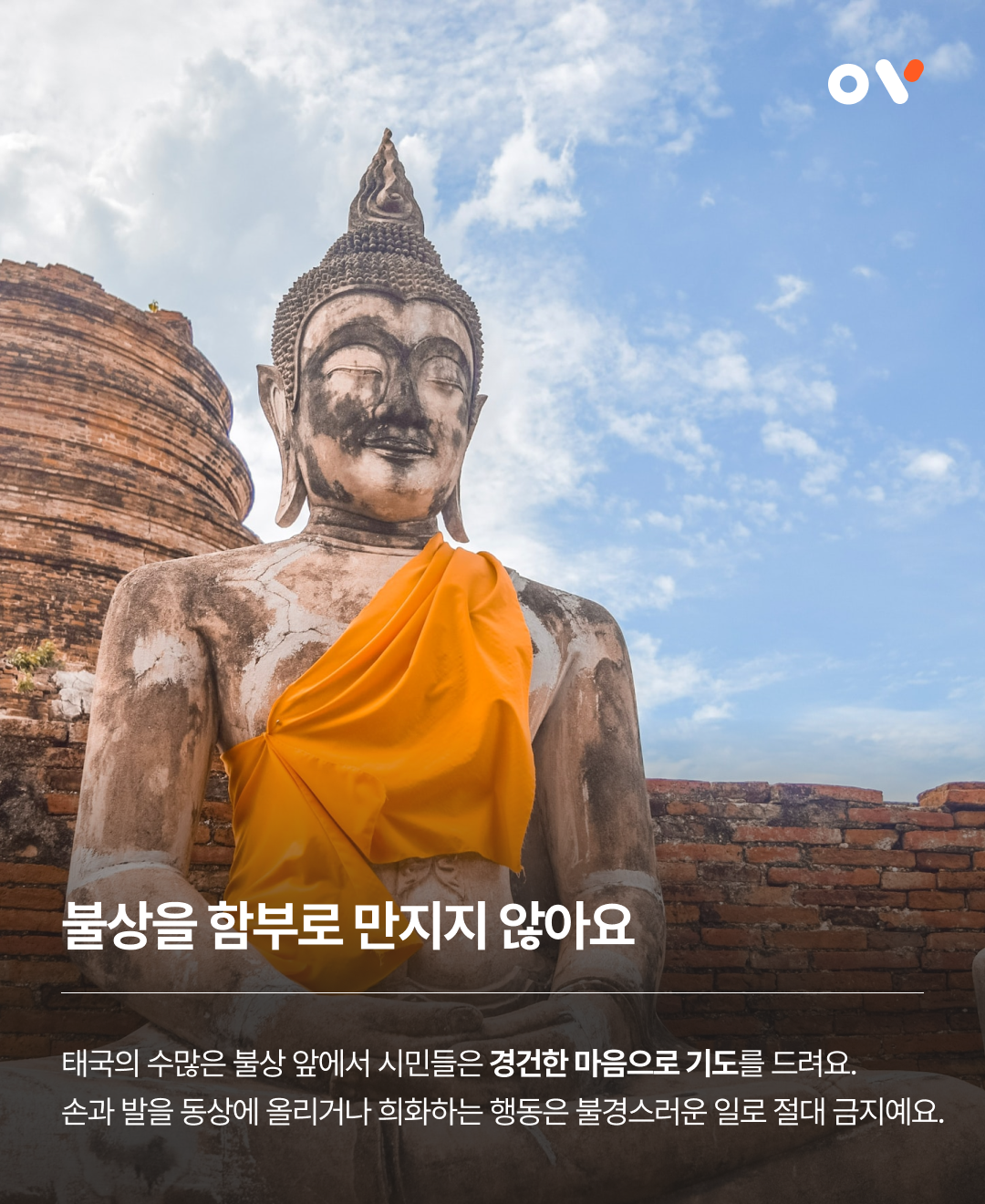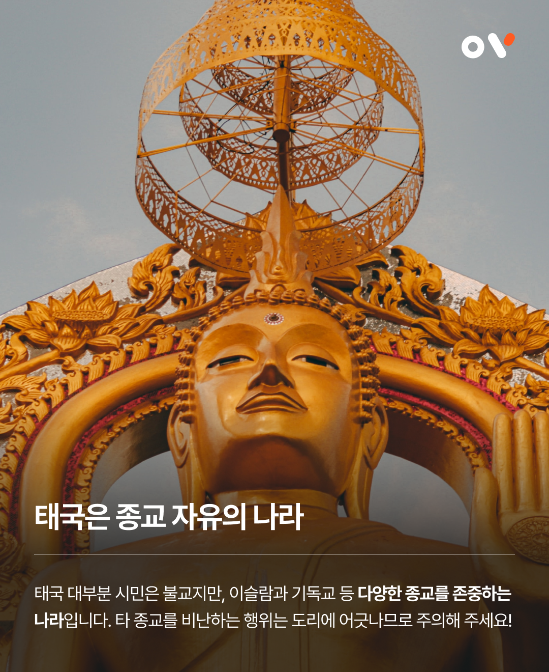 태국 대부분 시민은 불교지만, 이슬람과 기독교 등 다양한 종교를 존중하는 나라입니다. 타 종교를 비난하는 행위는 도리에 어긋나므로 주의해 주세요!
