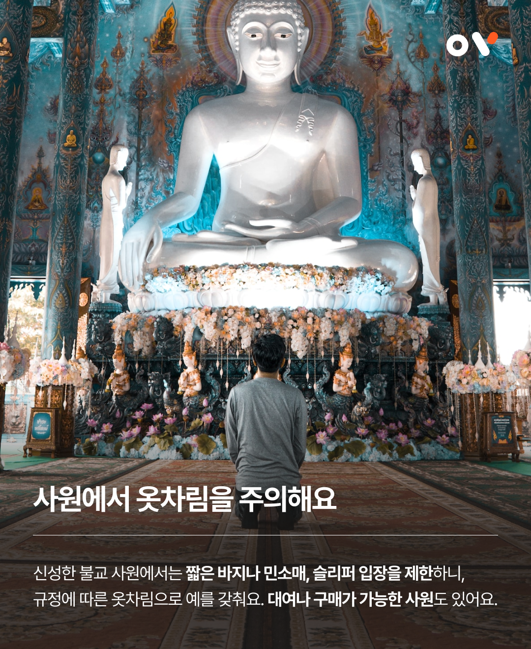 신성한 불교 사원에서는 짧은 바지나 민소매, 슬리퍼 입장을 제한하니, 규정에 따른 옷차림으로 예를 갖춰요. 대여나 구매가 가능한 사원도 있어요.