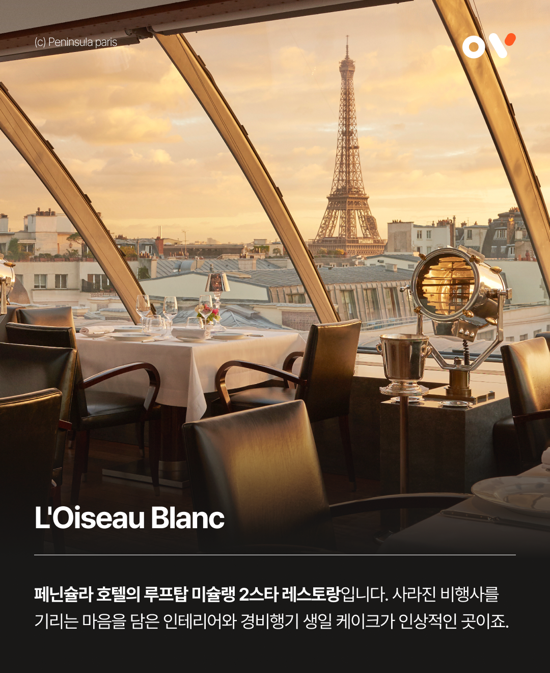 페닌슐라 호텔의 루프탑 미슐랭 2스타 레스토랑입니다. 사라진 비행사를 기리는 마음을 담은 인테리어와 경비행기 생일 케이크가 인상적인 곳이죠.