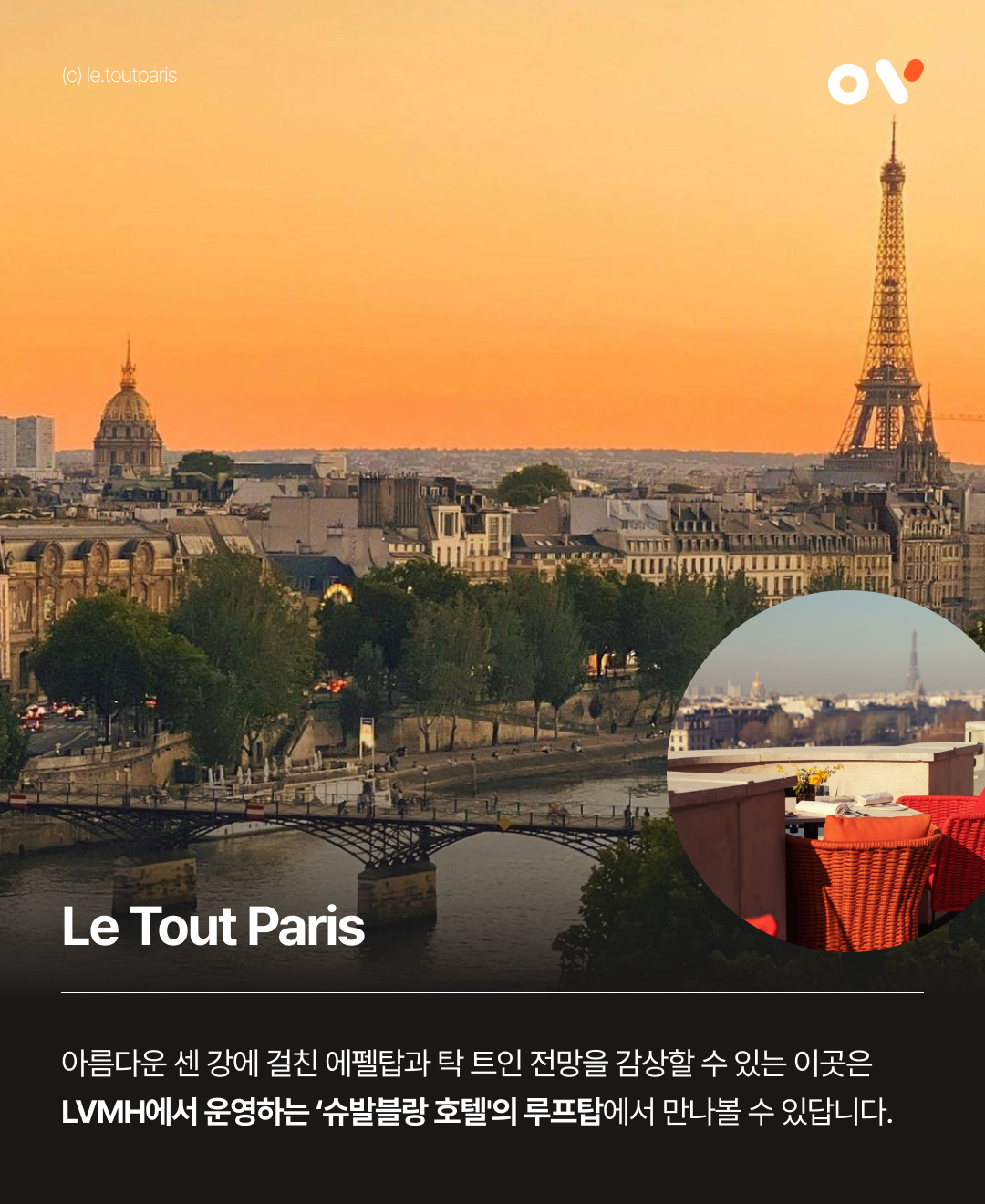 아름다운 센 강에 걸친 에펠탑과 탁 트인 전망을 감상할 수 있는 이곳은 LVMH에서 운영하는 ‘슈발블랑 호텔'의 루프탑에서 만나볼 수 있답니다.