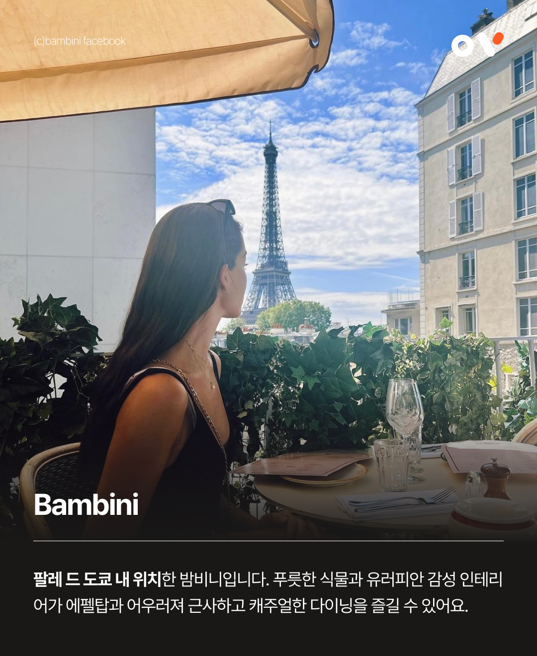 팔레 드 도쿄 내 위치한 밤비니입니다. 푸릇한 식물과 유러피안 감성 인테리어가 에펠탑과 어우러져 근사하고 캐주얼한 다이닝을 즐길 수 있어요.