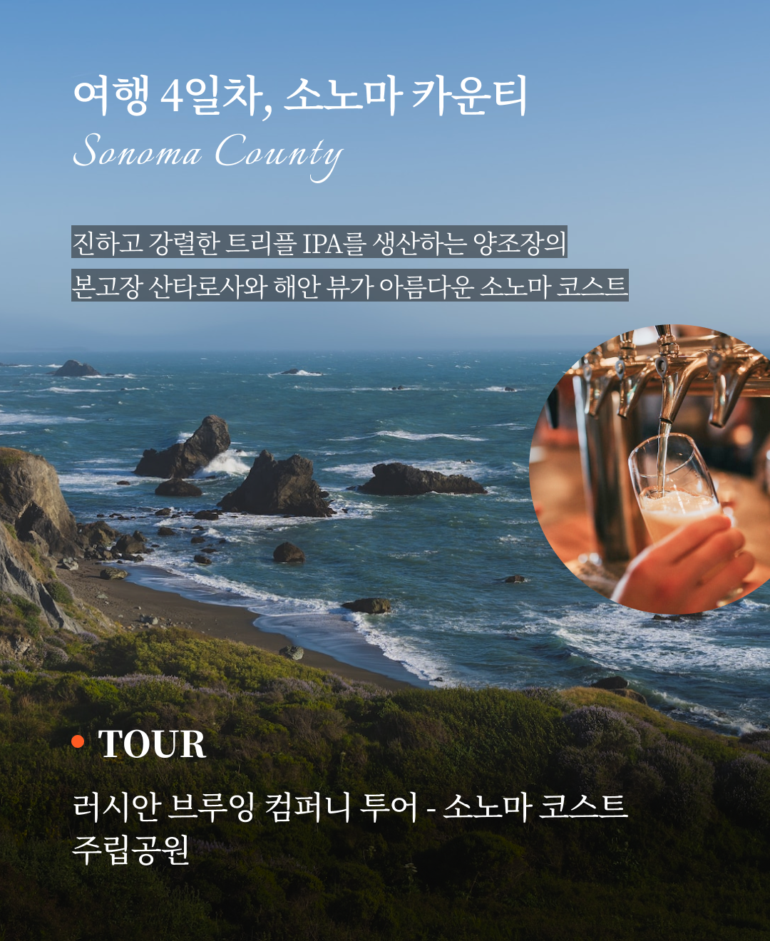 맥주 애호가들의 드림 브루잉 컴퍼니에서 풍미 가득한 맥주를 시음하고, 소노마 코스트 주립공원에서 여유를 즐기며 하루를 마무리해 볼까요?