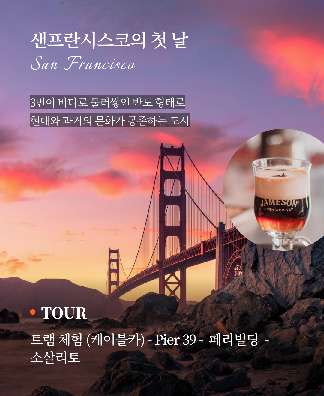 샌프란에서의 첫 날, 장시간의 비행으로 비록 몸은 피곤하지만 Pier 39에서 맞이하는 태평양의 바람이 상쾌합니다. 역사가 담긴 페리빌딩과 아름다운 소살리토로 떠나보세요.