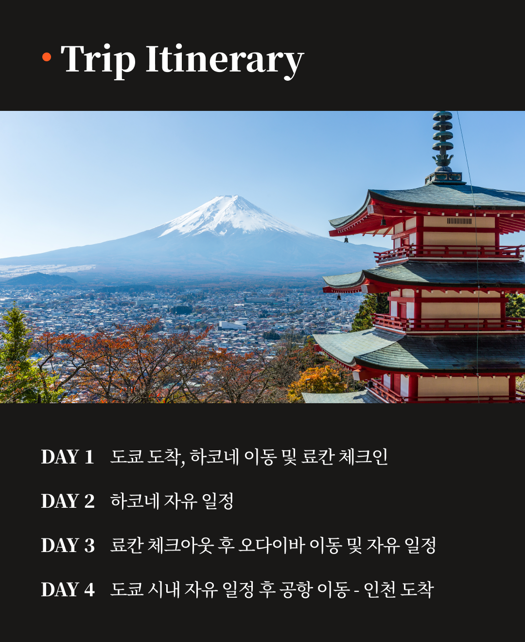 도쿄 도착 및 하코네 이동, 2일간 자유일정 및 료칸 즐기기