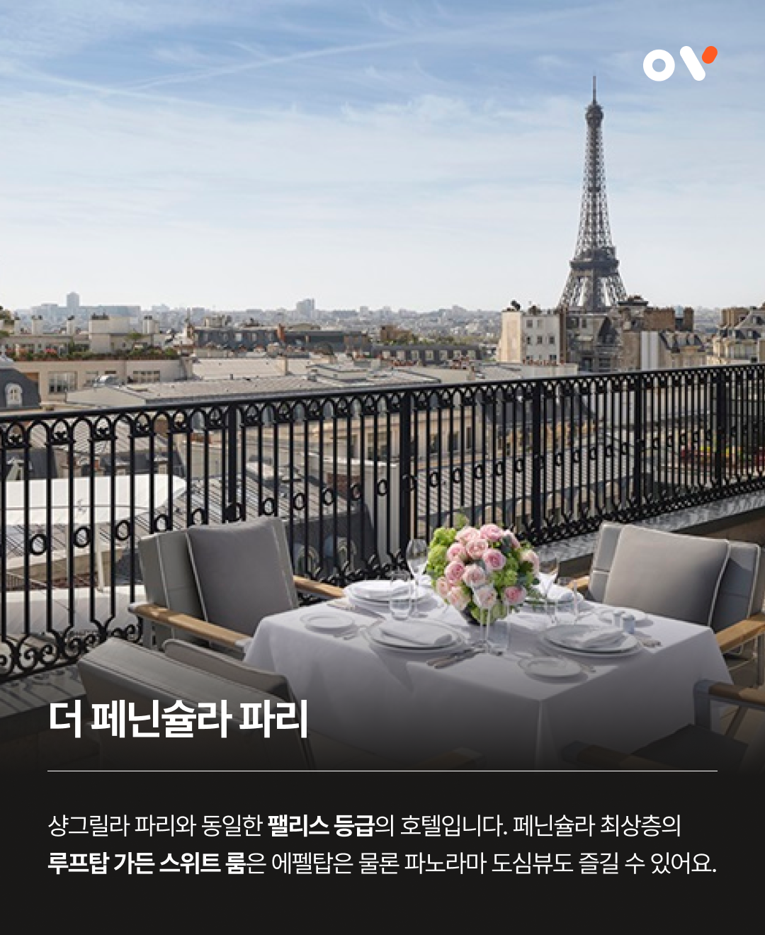 샹그릴라 파리와 동일한 팰리스 등급의 호텔입니다. 페닌슐라 최상층의 루프탑 가든 스위트 룸은 에펠탑은 물론 파노라마 도심뷰도 즐길 수 있어요.