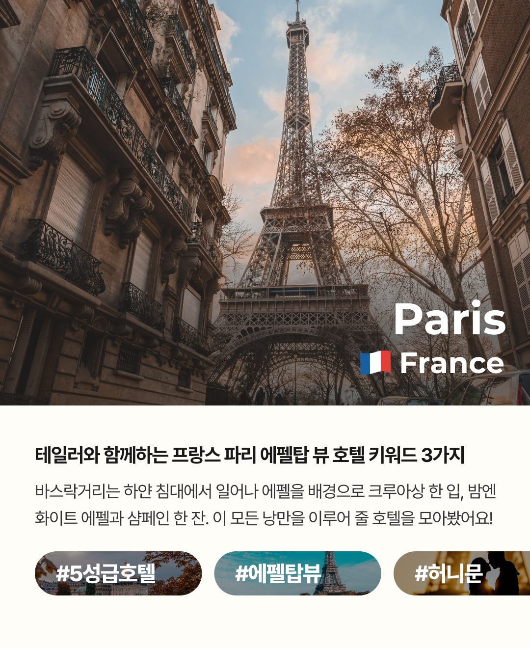밤엔 화이트 에펠과 샴페인 한 잔. 이 모든 낭만을 이루어 줄 호텔을 모아봤어요!