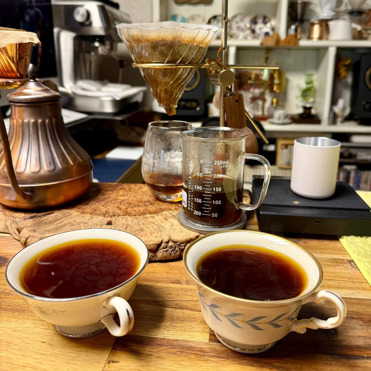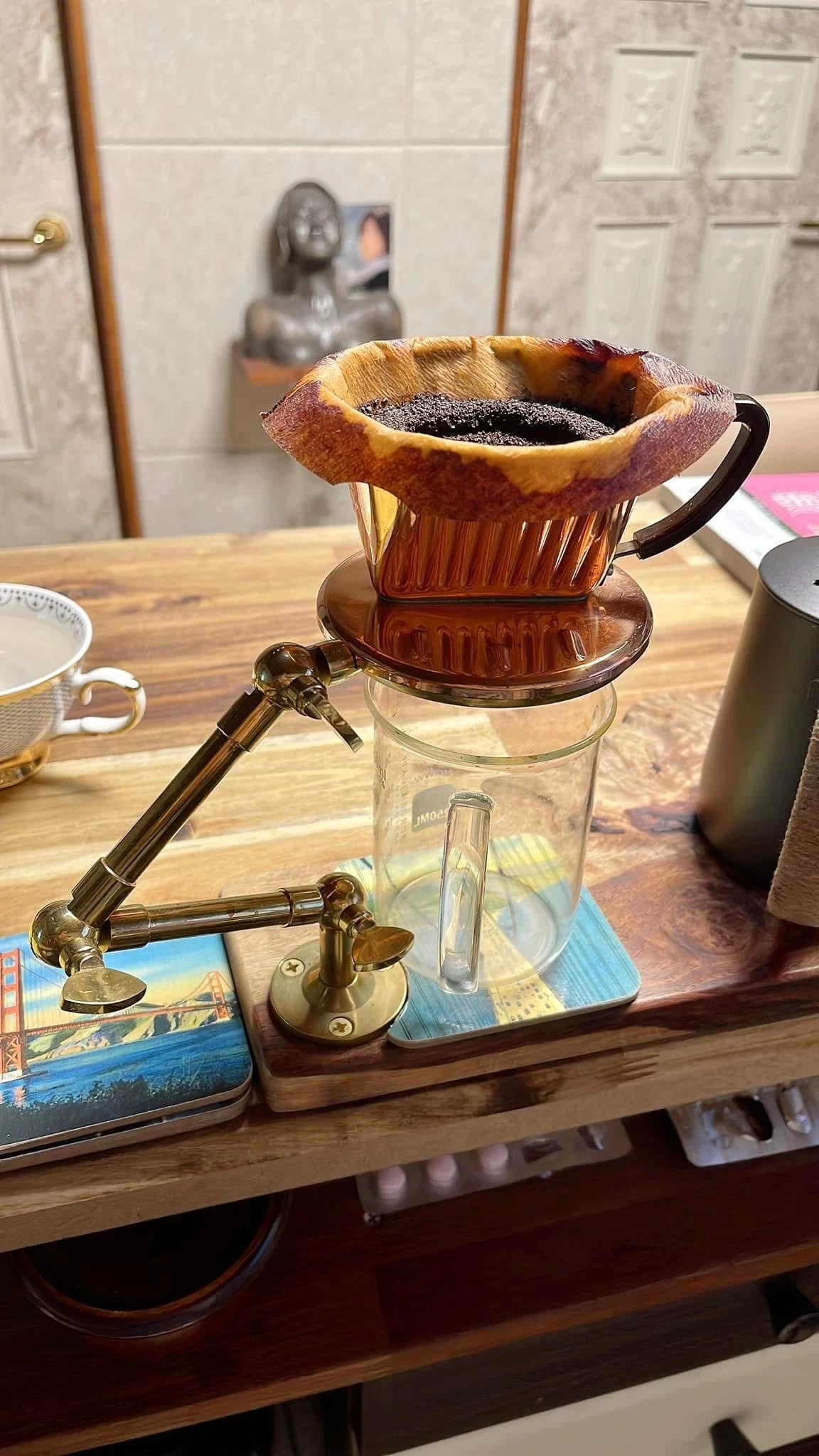 사진 속에 쌓여 있는 드리퍼는 가장 안쪽에 스트로베리 드리퍼 그다음은 경사각이 웨이브 진 변형된 하리오 마지막으로 리브 만으로 구성된 하리오 드리퍼다.