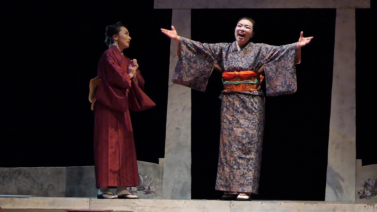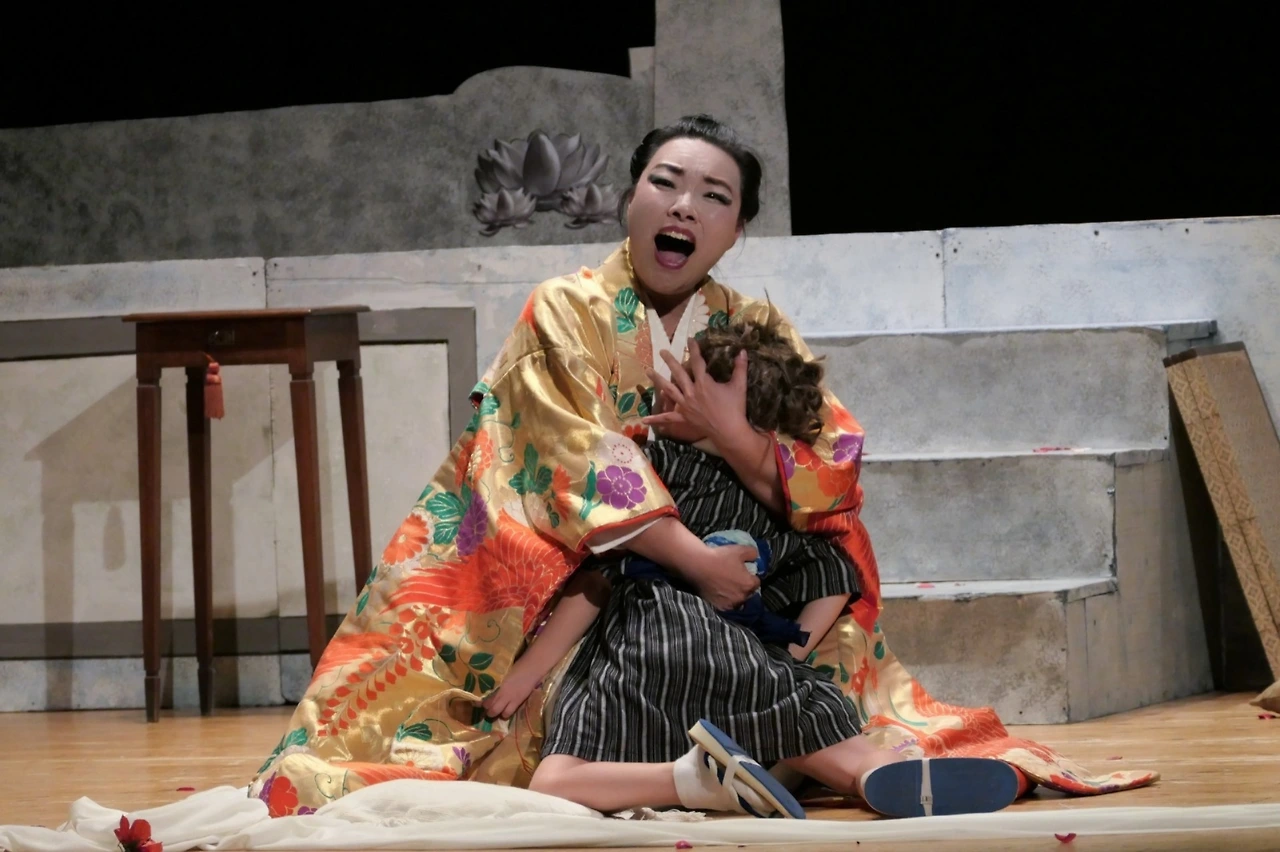 화려한 무늬의 기모노를 입고 품에 아이를 안은 채 오열하는 여인.
