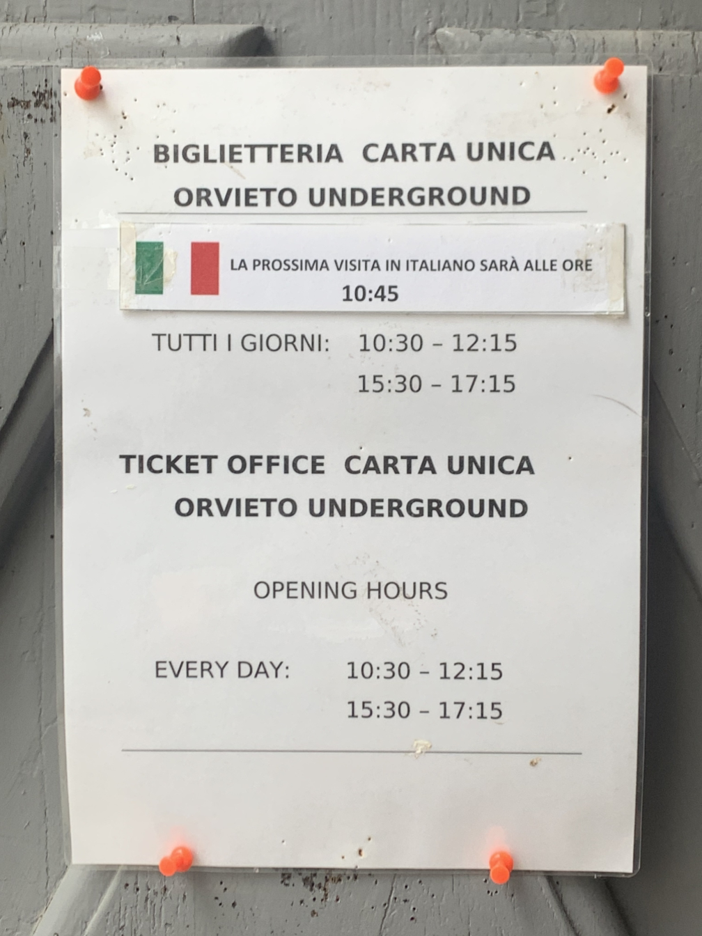 오르비에토를 검색하다 알게 된 지하도시가 궁금했다. 종교적인 박해를 피해 지하에 비밀도시를 만들어 생활했던 크리스천들이 떠올랐다. 카타콤처럼 역사적인 장소가 우리 발아래 있다는 사실에 나는 잔뜩 고무되었다. 미리 방문 예약을 하지 않았기에 볼 수 있을지 알 수 없었지만, 일단 매표소로 가보기로 했다. 매표소는 오르비에토 두오모 바로 앞에 있었다. 매표소 앞에는 10명이 넘는 사람들이 모여 있었다. 그리고 매표소엔 이런 안내문이 붙어 있었다.