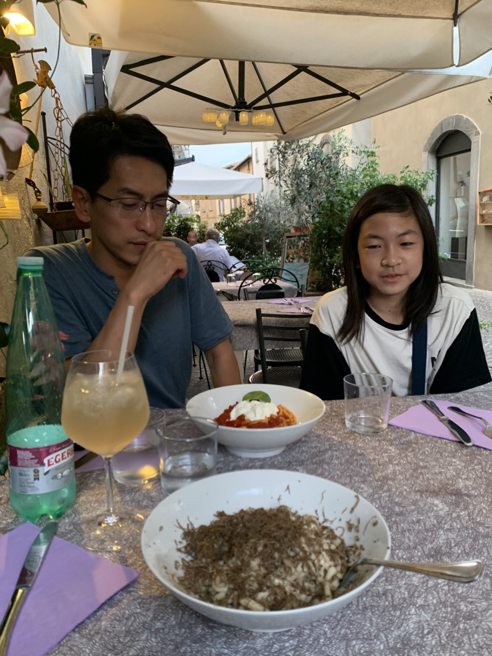 평소에도 맛집을 찾아다니지 않는 우리는 적당한 위치에 있는 적당한 가격의 적당한 레스토랑 야외 테이블에 앉았다. 언제 어디서 시켜도 절대 실패하지 않는 페페로니 피자와 볼로네제 파스타, 고기가 먹고 싶다는 딸을 위해 스테이크를 시켰다. 나는 특별한 곳에 왔으니 특별한 음식을 먹어보고 싶어 트러플 파스타를 시켰다.
