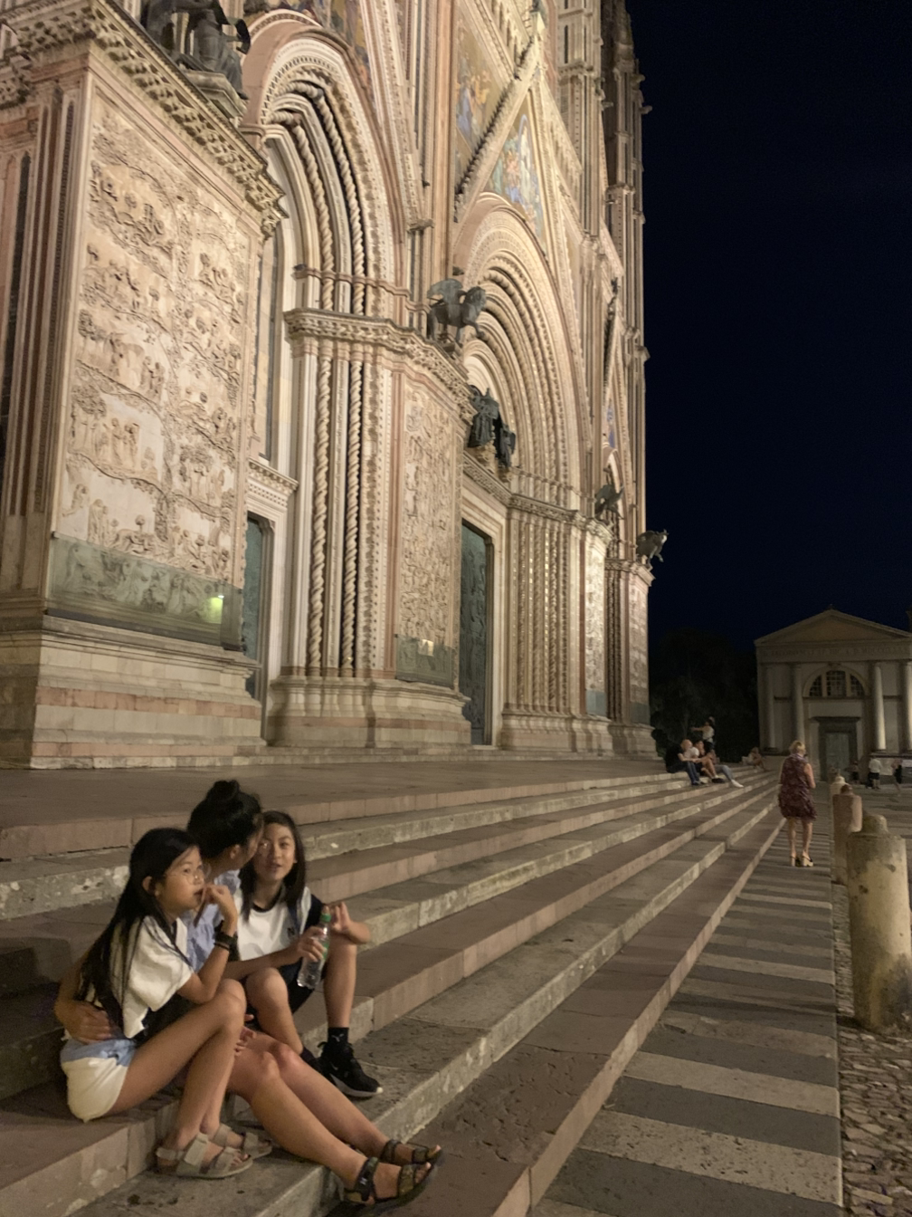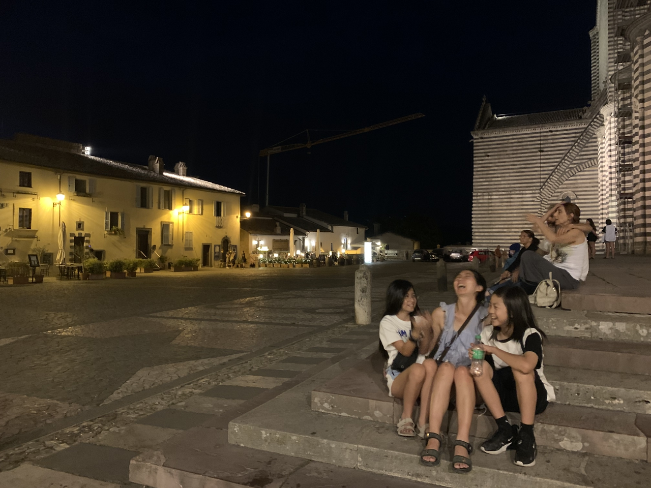 이대로 숙소로 들어가긴 아쉬웠다. 양쪽에 아이들의 팔짱을 끼고 오르비에토 대성당 앞으로 발걸음을 옮겼다. 늦은 밤, 대성당 앞은 꽤나 한가했다. 몇몇의 여행객들이 앉아있을 뿐이었다. 나는 한껏 취한 사람처럼 아이들과 뱅글뱅글 춤을 추면서 성당 앞 계단에 앉았다. 맞은편에 보이는 바에서 흥겨운 노랫소리가 흘러나왔다.