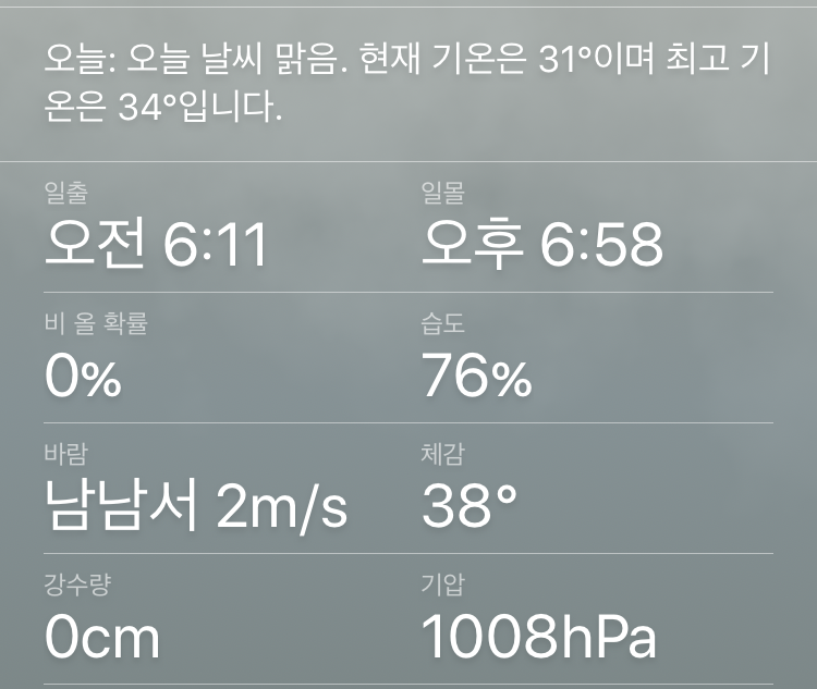 현재 기온은 31도, 체감온도는 38도.