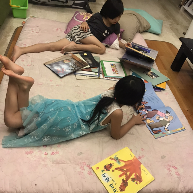 오늘 오전, 으니는 온라인 수업을 들었다. 그 앞에서 아니는 책을 읽고, 그 옆에서 난 책을 보며 필사를 했다. (남편은 홀로 방 안에서 재택근무 중)