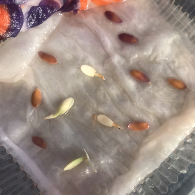 멜론 씨를 시작으로 귤 씨, 오렌지 씨, 파파야 씨, 수박씨를 발아시키고 있다. 그중에 멜론 씨에서 뿌리가 나와 흙에 옮겨 심어주었다.