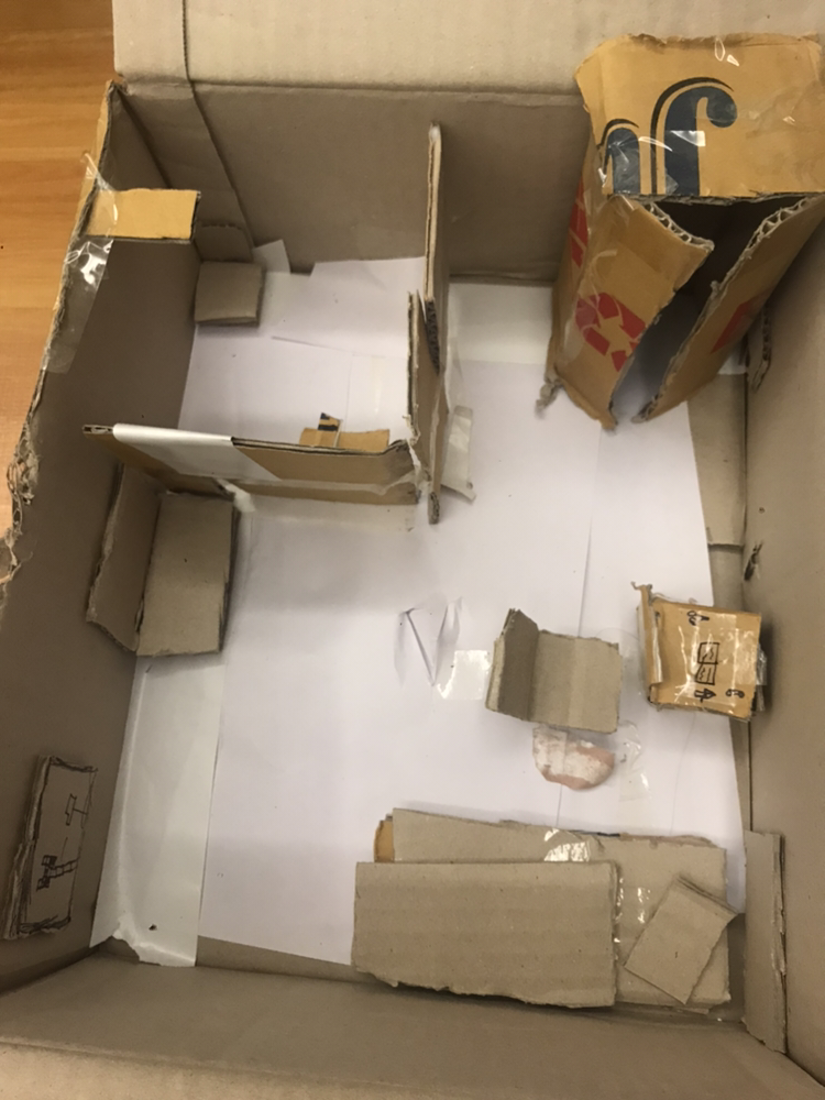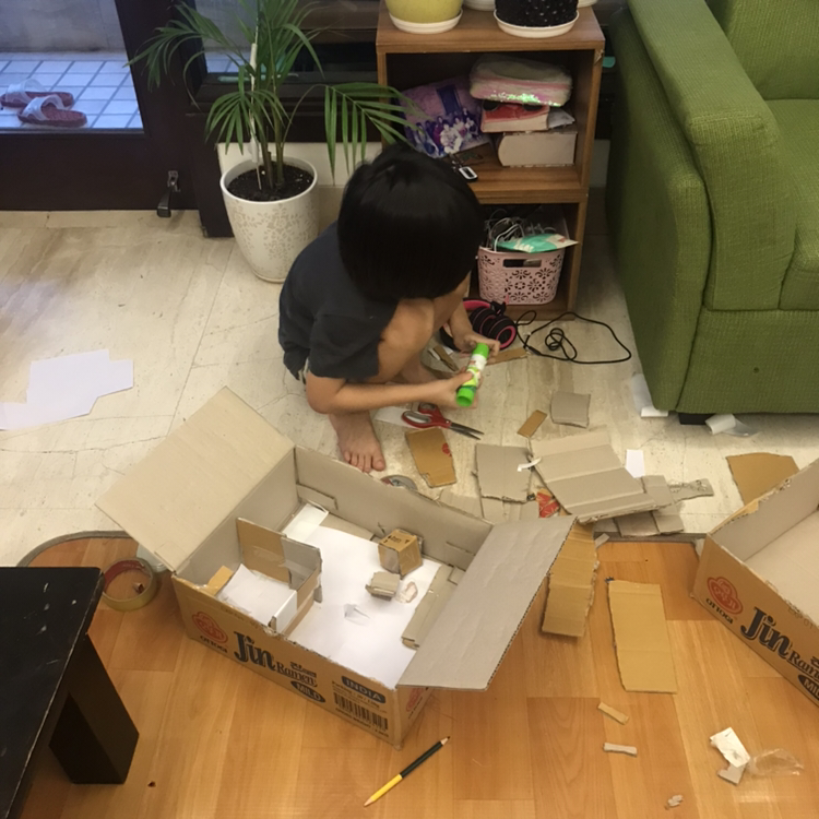 쓰레기봉투 다 떨어지면 쓰레기 담으려고 아껴두었던 라면 박스인데, 어떻게 발견했는지 끄집어 내 왔다. 그리곤 거실을 엉망으로 만들면서 집을 하나 뚝딱. 화장실과 변기도 있어요.