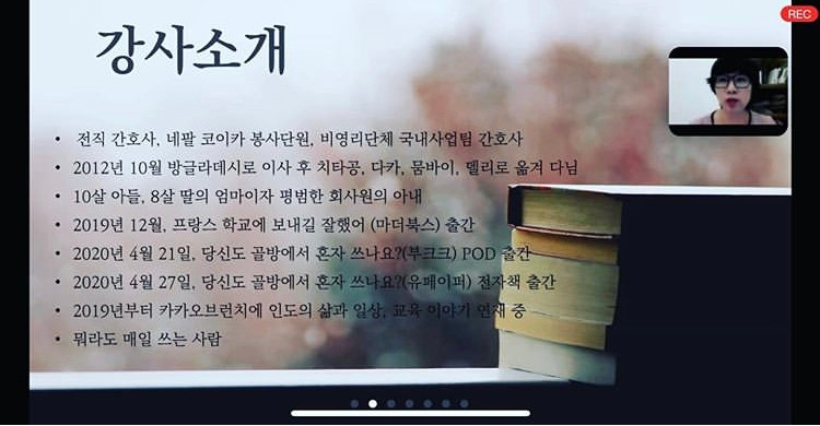 그렇게 준비한 강의를 드디어 어제저녁에 하게 되었다. 총 12명이 참석하였고, 한국 시간으로 10시부터 자정까지 진행되었다. 처음 글을 쓰기 시작한 이야기부터 어떻게 글을 썼는지와 부크크, 유페이퍼로 책 만드는 법을 간단하게 알려 주었다.