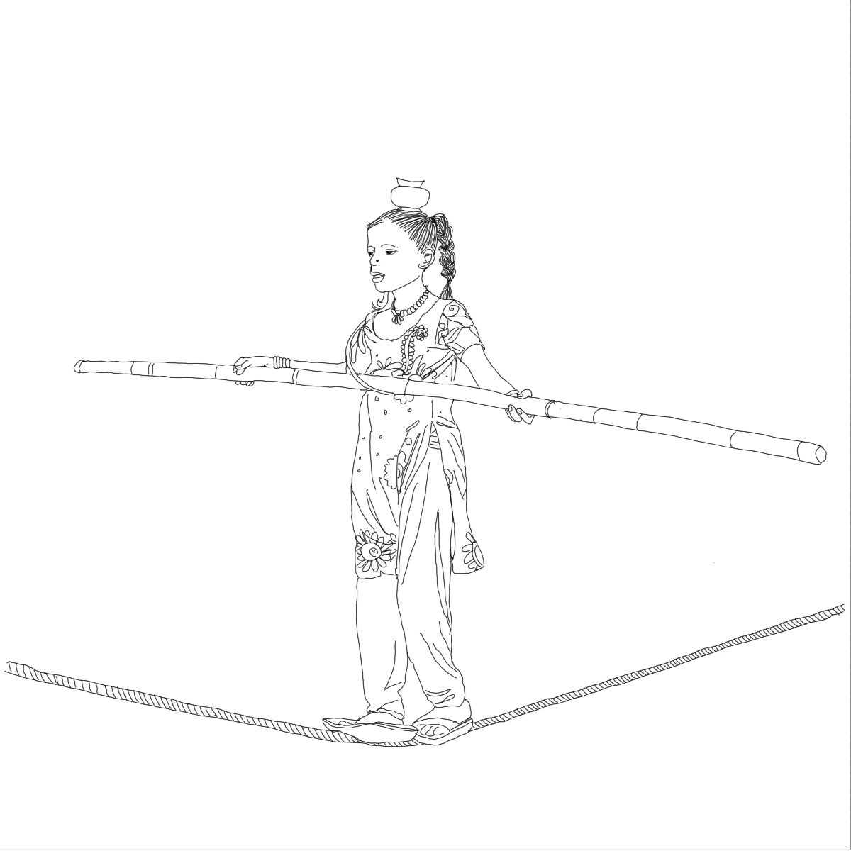 한 여자 아이가 외줄을 타고 있는 사진이었다. 유심히 보니 머리 위엔 항아리가 올려져 있었고, 손에는 긴 막대기가 들려있었다. 한쪽엔 슬리퍼를 신고 한쪽엔 찌그러진 접시 위에 발을 올려놓았다.