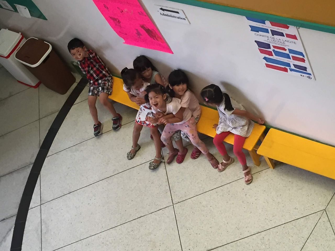 큰아이는 유치원 과정으로, 둘째는 널서리(어린이집) 과정으로 입학이 되었다. 유초등학년 통 틀어 한국 아이는 우리 아이 둘 뿐이었다. 아이들 반에는 여러 나라의 아이들이 있었다. 일본, 중국, 인도, 방글라데시, 네덜란드 등 여러 국적의 아이들이 있었고 몇몇의 프랑스 아이들 있었다. 그래서 대부분의 아이들은 수업시간에는 프렌치로 수업을 하지만 자기들끼리는 영어로 의사소통을 했다.