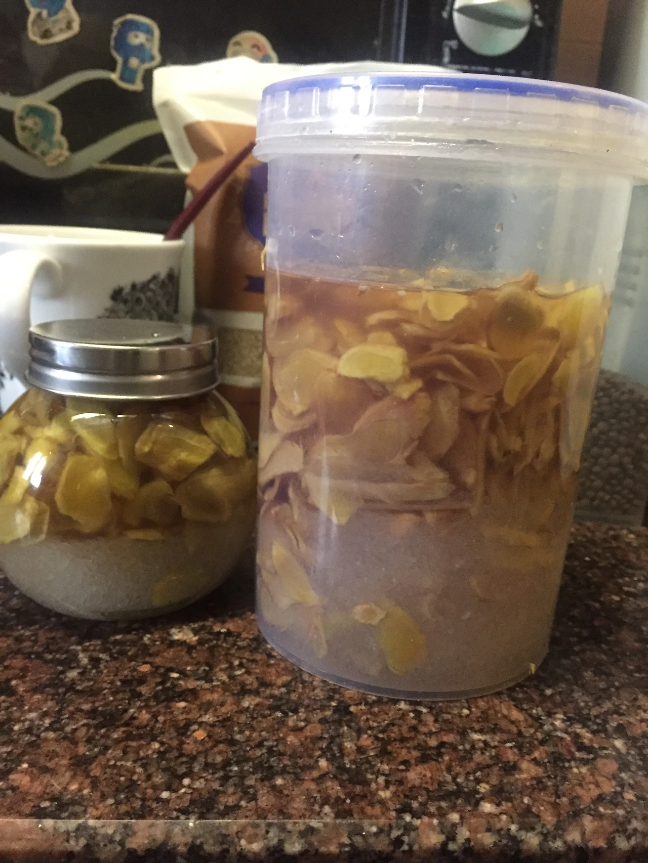 하루가 지나고서야 설탕은 녹고 생강즙이 많이 생겼습니다.
