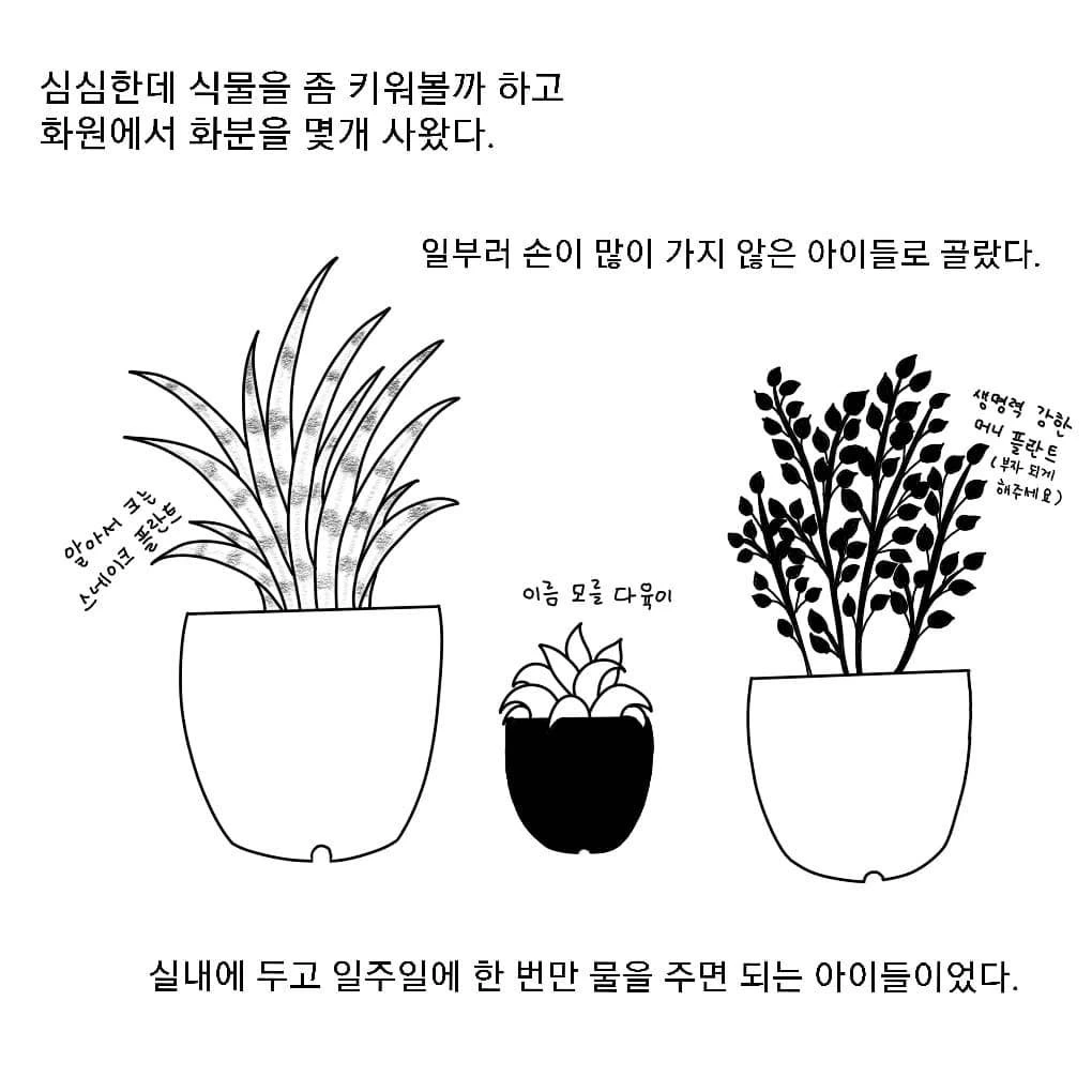 가장 손이 안 가는 녀석들이었다. 산세베리아라고도 불리는 스네이크 플란트, 금전수라 불리는 머니 플란트, 그리고 귀여운 다육이까지.