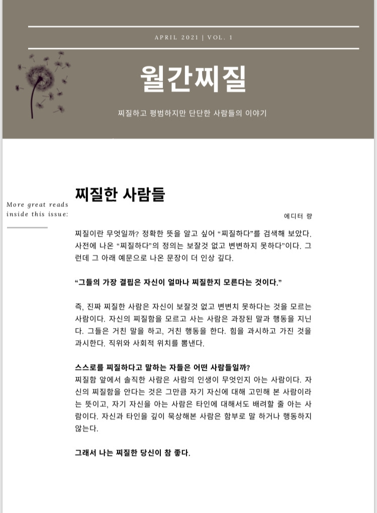 월간 찌질이라는 매거진을 만들어 무료 발행을 하고, 후기를 읽으며 즐거워한다.