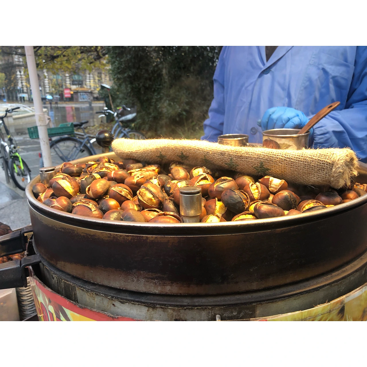 성 바로 앞 노점상에서 그윽한 커피 향이 풍겼다. 이끌리듯 다가가 카푸치노 한잔을 테이크아웃으로 주문했다. 노점상 한쪽 끝에 한 아저씨가 군밤을 팔고 있었다. 밀라노에서 군밤이라니!! 괜히 반가워 핸드폰을 들고 사진을 찍었다.