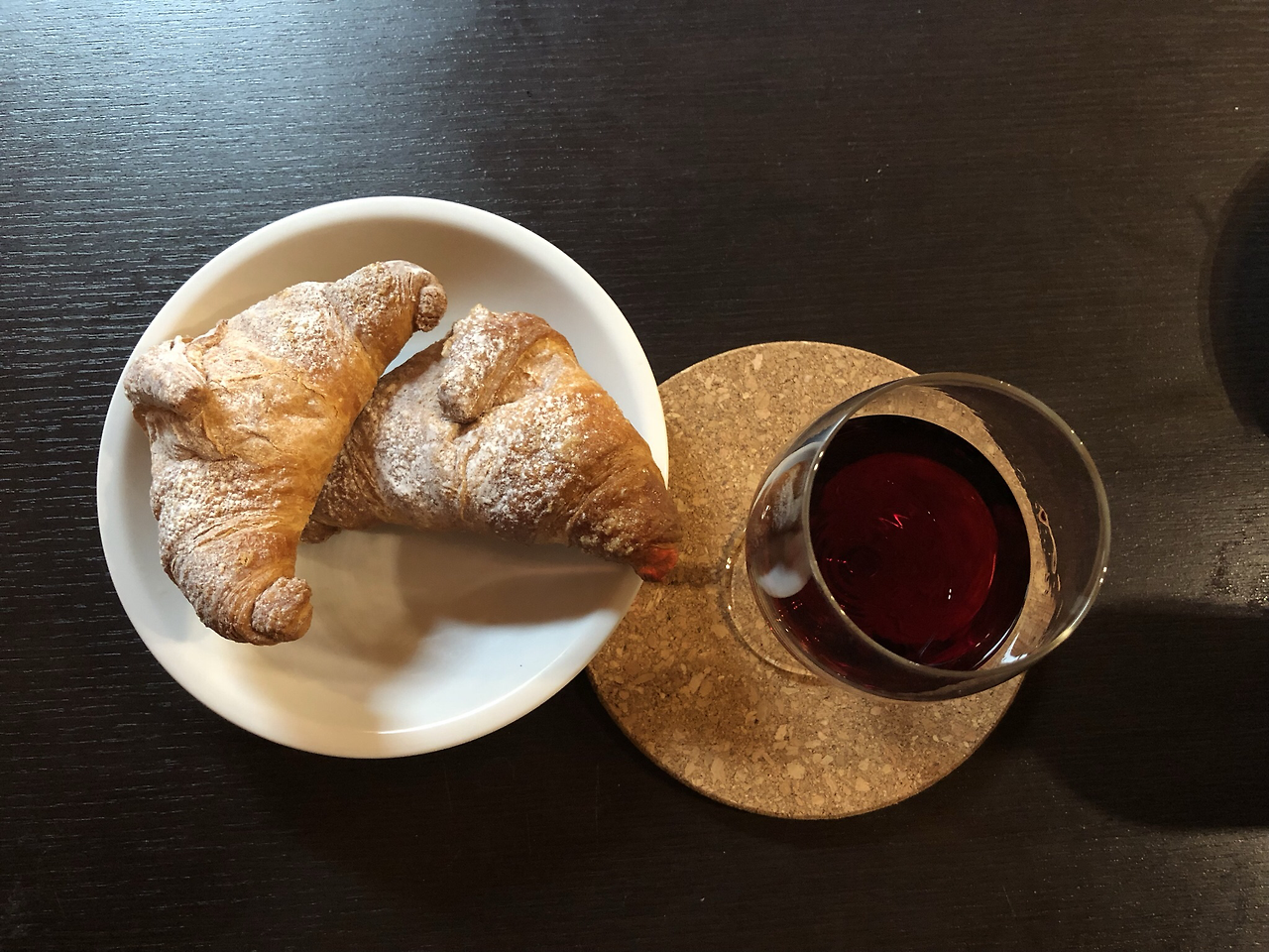 크루아상 하나를 접시에 담고, 방금 산 와인을 따서 잔에 따랐다.