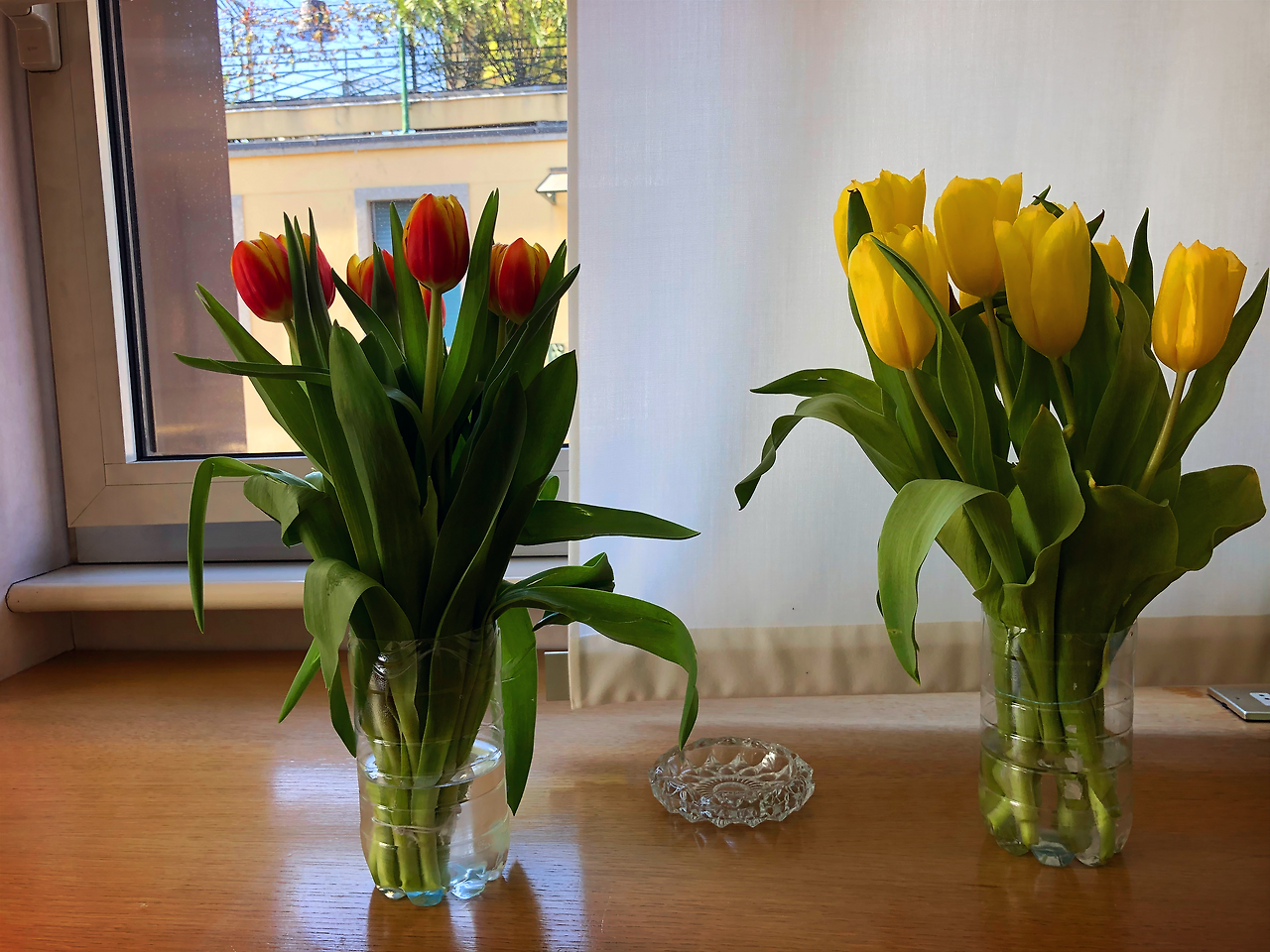 숙소로 돌아와 생수병을 하나 더 잘라 주황색 튤립 한 다발을 꽂았다. 활짝 핀 노란색 튤립 옆에 이제 막 봉우리를 틔운 주황색 튤립 한 다발을 놓았다.