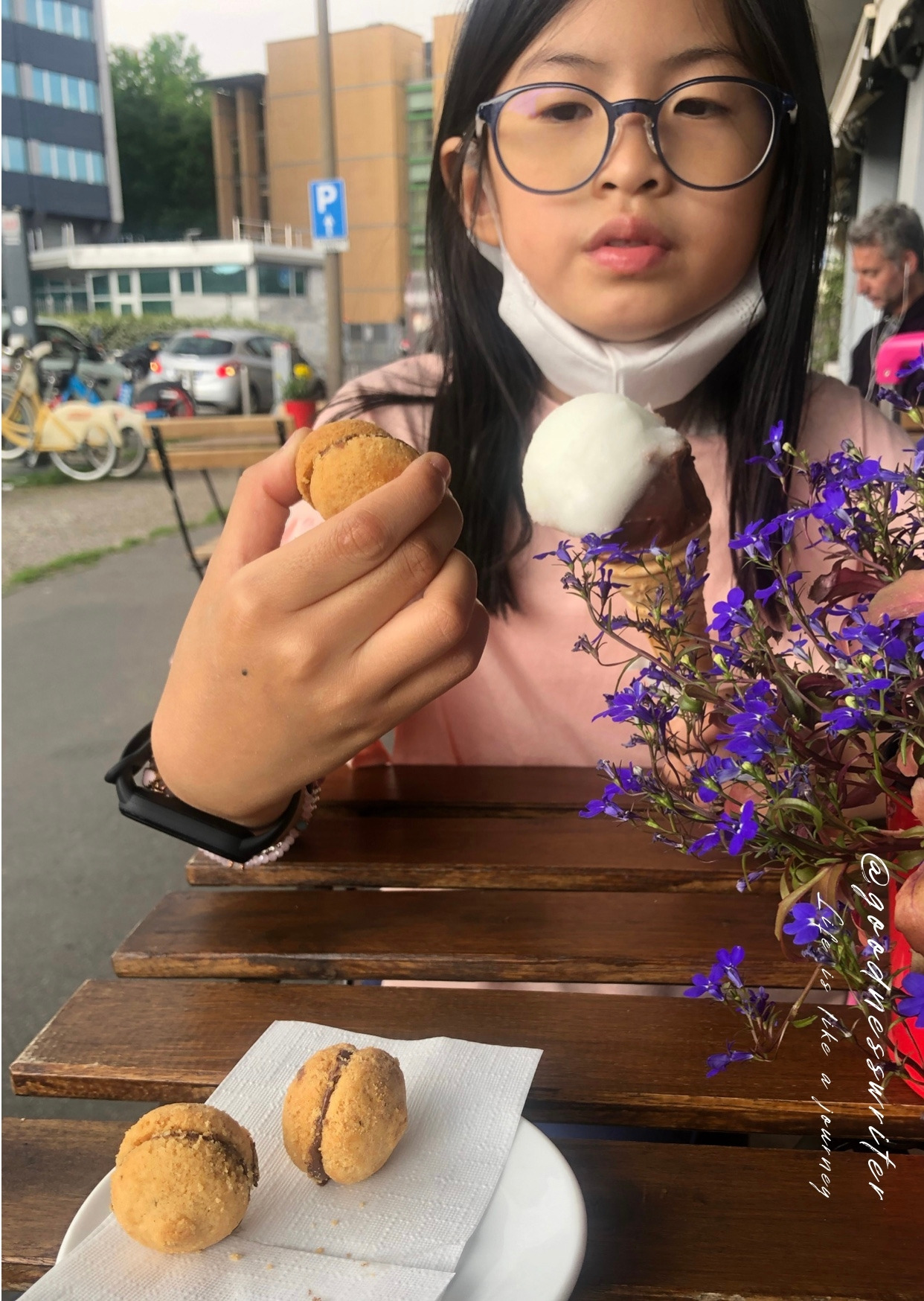 영어 가능 아저씨에게 카푸치노 한 잔과 젤라또 두 개와 '바치 디 다마(Baci di Dama)' 3개를 주문했다. '바치 디 다마'는 마카롱이나 다쿠아즈처럼 생겼지만 맛은 전혀 다르다. 헤이즐넛 맛이 나는 쿠키 두 개가 초콜릿을 감싸고 있다. 그 모양이 여인의 입술을 닮아 붙여진 '바치 디 다마'의 뜻은 여인의 키스라고 한다. 영어 가능 아저씨가 친절하게 알려주었다.