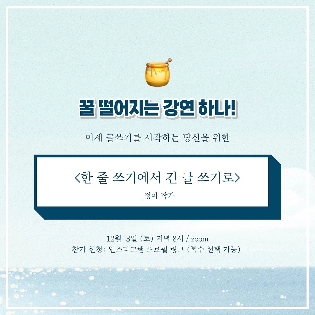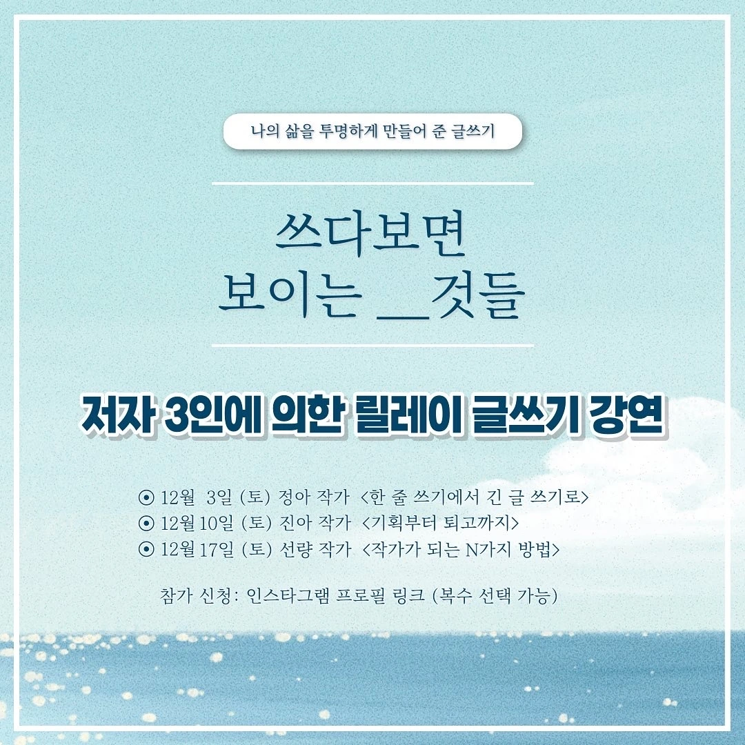 저희 세 사람이 준비한 강연과 함께 조금 더 넓어진 글쓰기를 경험하실 수 있기를 바랍니다.