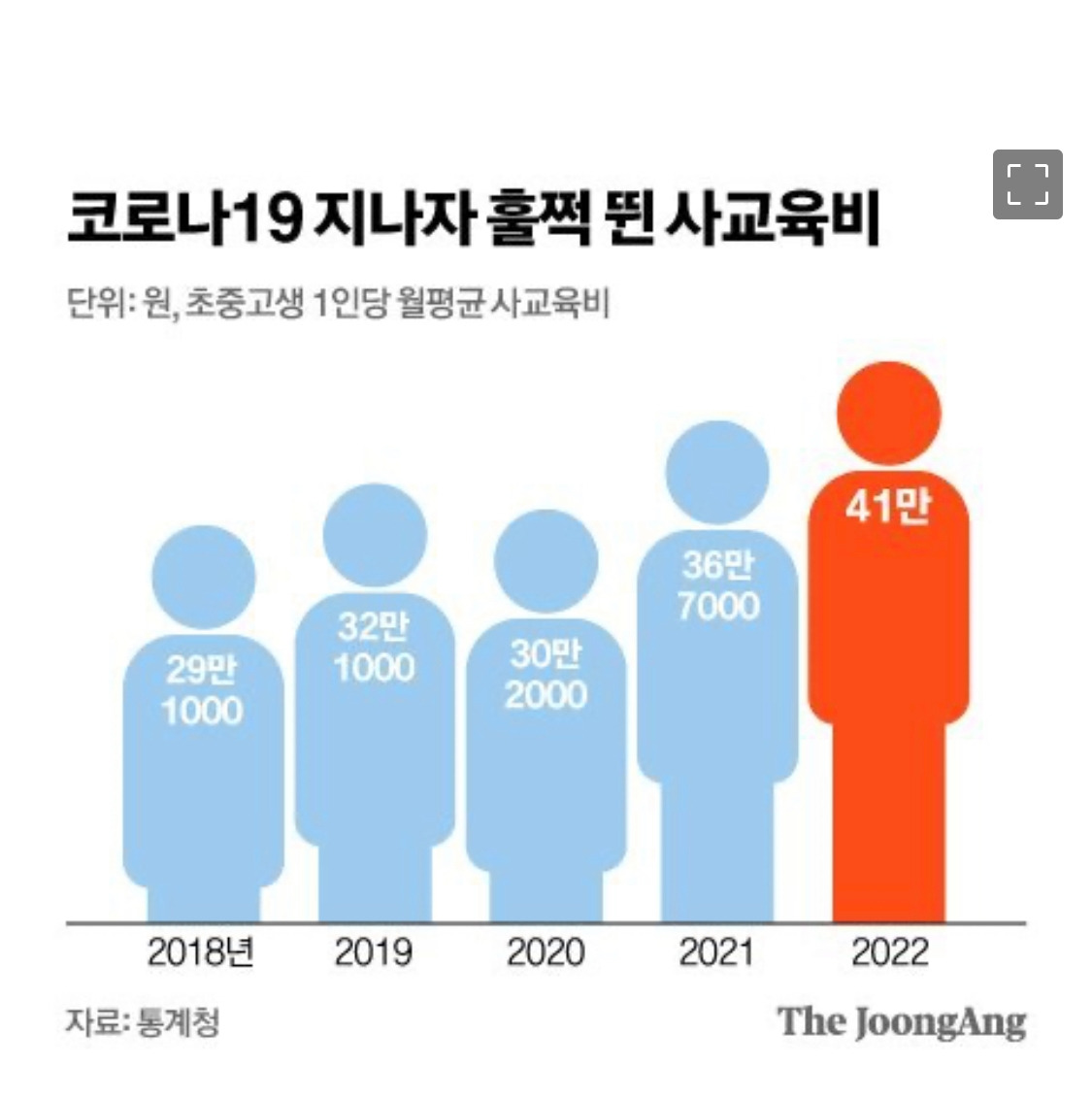 교육부와 통계청은 전국 초중고교생 7만 4000여 명을 대상으로 '2022년 초중고교 사교육비' 실정을 조사, 발표했는데 지난해 사교육비 총규모는 26조 원으로 1년 만에 역대 최고치를 경신했다고 발표했다. 또한 학생 1인당 월평균 사교육비도 41만 원으로 역대최고치라고 한다.