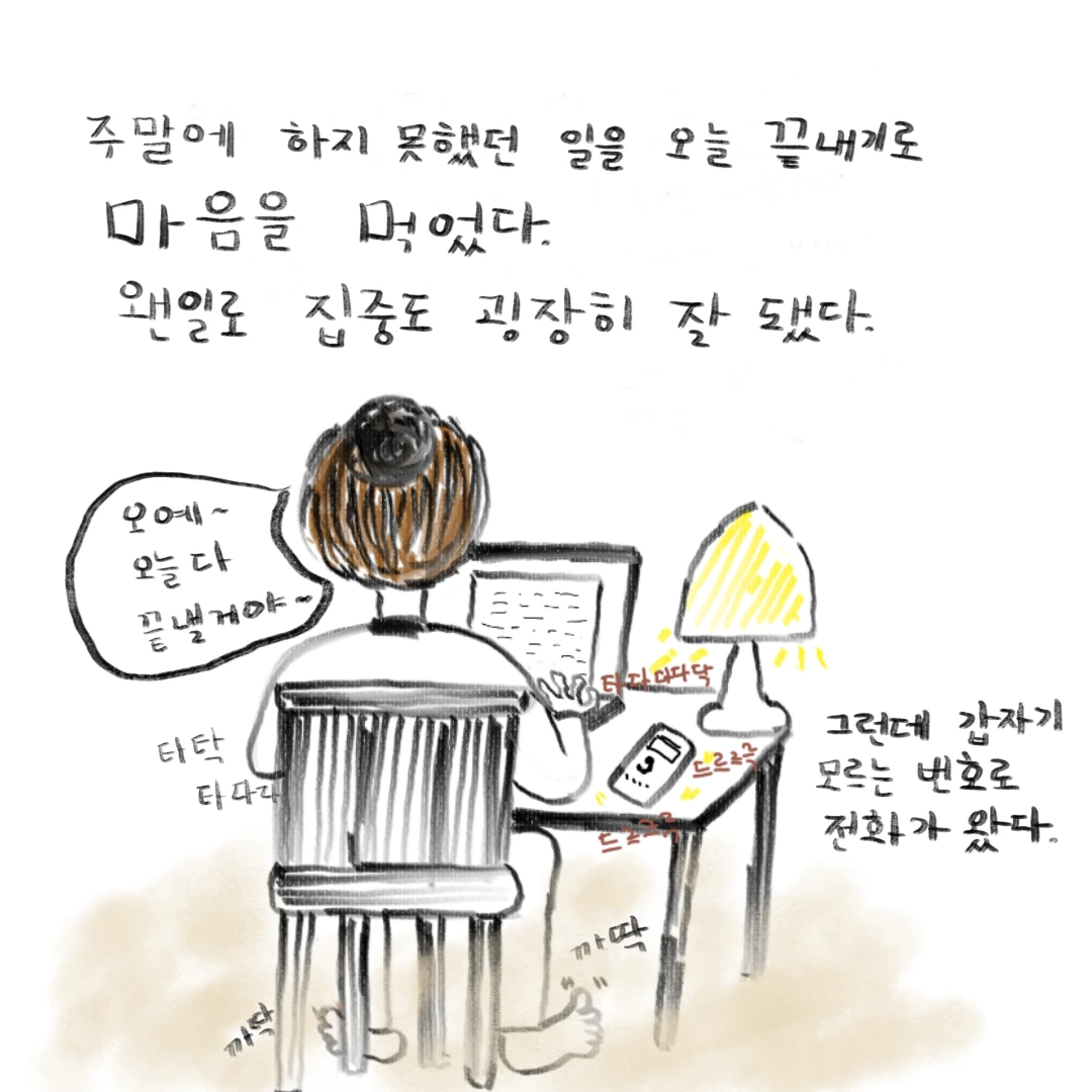 이른 아침부터 노트북을 펼쳤다. 웬일로 집중이 잘 되었다. 이 속도라면 오늘 내로 일을 끝낼 수 있을 것 같았다.