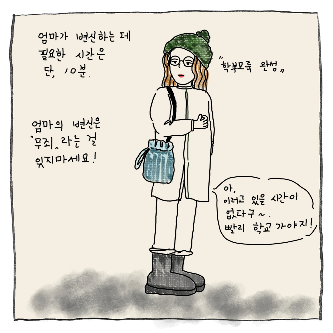집에선 무릎 나온 츄리닝을 입고, 똥머리를 하고 있지만, 학교 갈 땐 학부모 룩을 해야 한다.