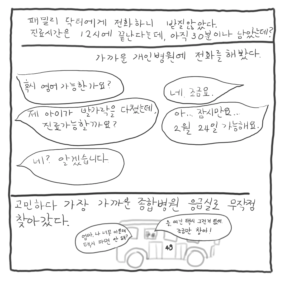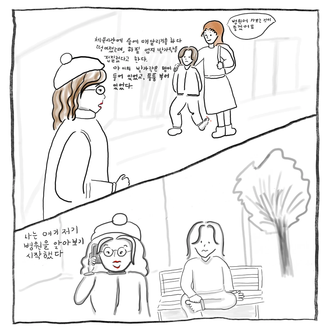결국 고민하다 집 근처에 있는 종합병원으로 향했다. 지하철 타고, 버스 타고 가는 길, 아이는 발이 아파 빨리 걷질 못했고 절뚝거리며 병원을 찾아갔다.