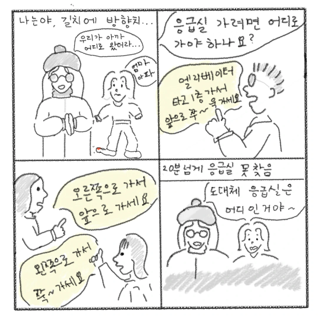 구글번역기를 들고 표지판을 번역하며 찾아봐도 응급실이 어디인지 도통 알 수 없었다.