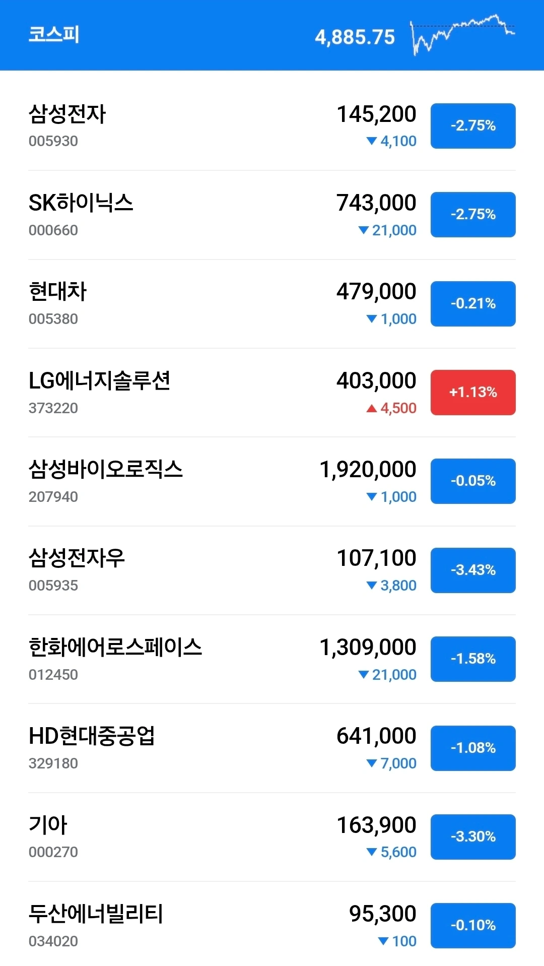 시총 상위 10개 종목 중 lg엔솔 제외하고 조정받고 있어서 저가매수의 기회가 될 수 있습니다. 다만 3000p에서 4000p 오를 때도 3800p 부근에서 횡복한 적이 있어서 5000p 넘어갈 때도 4000p 후반에서 어느 정도 횡복하는 기간이 있을 것으로 보이니 한번에 들어가기보단 나눠서 들어가는 게 좋을 것 같습니다.