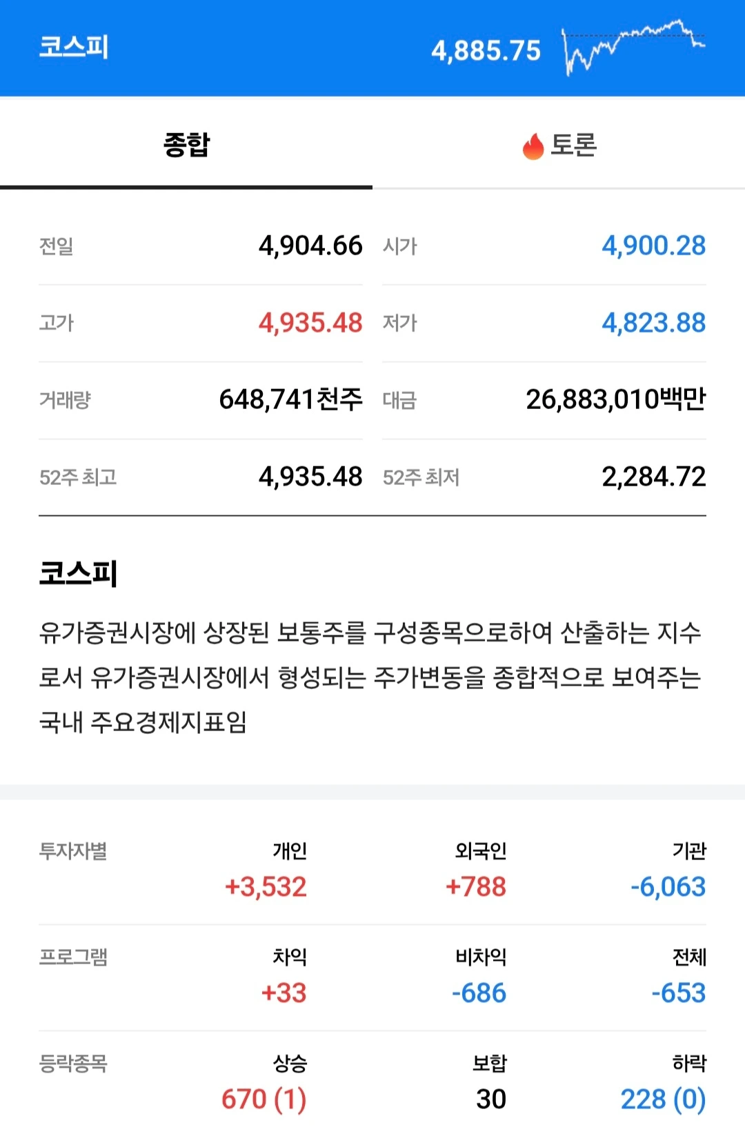 앞자리 바뀌기 전에 이런 현상이 빈번한 이유는 목표가를 5000p로 정했을 때 4900p에서 미리 차익 실현하는 매물들이 나오기 마련인데 기관들이 빠진 것으로 봐선 예정된 계획대로 움직이는 것 같네요.