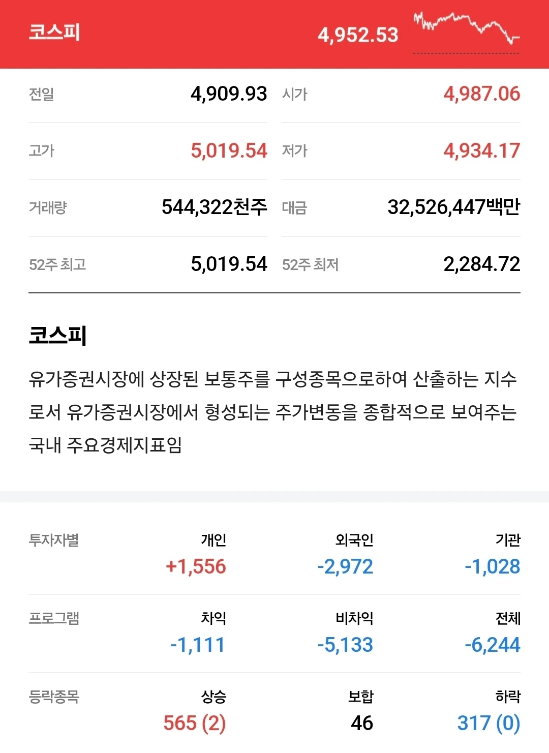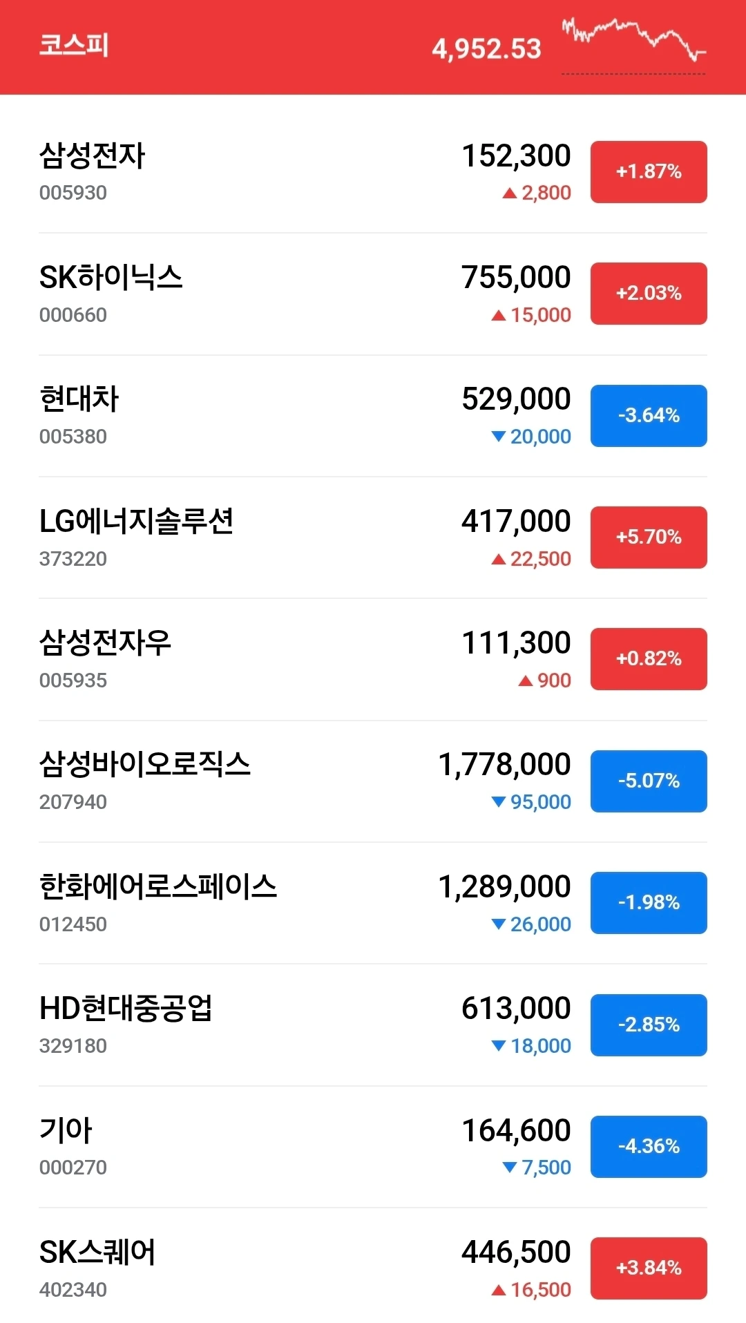 드디어 오늘 코스피가 한국증권거래소 설립 이후 70년만에 5000p를 넘었습니다. 벌써 올해에만 20% 가량의 상승세를 기록하며 압도적 세계 1위 상승률을 기록하고 있는데요. 해외에선 여전히 한국 증시가 저평가 됐다며 아직도 코리아 디스카운트를 언급하고 있다는 점에서 6000p 달성도 무난히 가능하지 않을까 싶습니다. 막바지에는 반도체 관련주들은 올랐지만 며칠 사이에 많이 올랐던 로봇 관련주들과 현대차 계열사에서 조정이 나오면서 4952p로 마감했습니다. 어제 코스닥 시총 1위 알테오젠이 기대했던 것에 비해 훨씬 낮은 계약을 발표하며 하루만에 20% 넘게 빠졌고 오늘은 삼성바이오로직스가 5% 가량 빠진 점이 눈에 띄네요.