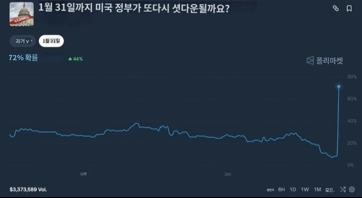 - 상황: 1월 31일 미국 정부 셧다운 확률이 85%까지 치솟음. 국토안보부(DHS) 예산을 둘러싼 민주당과 공화당의 싸움이 원인.