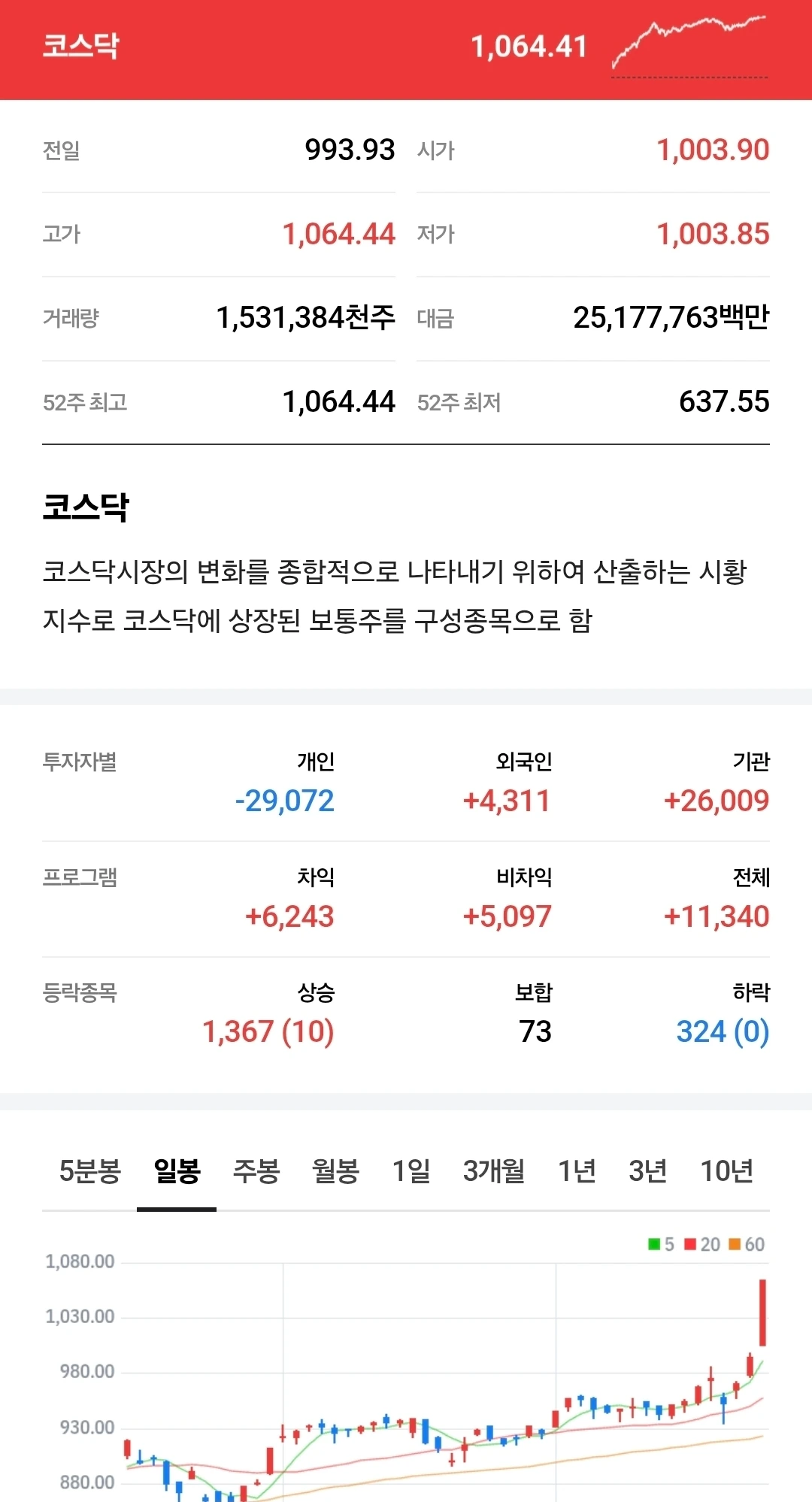 오늘은 코스닥이 7%대 급등하며 천스닥을 넘겼습니다. 장중 한 때 코스피 5000p 코스닥 1000p 동시에 넘기는 역사적 순간도 있었는데요. 코스피의 외국인과 기관 자금이 코스닥으로 넘어갔으며 개인은 코스닥에서 코스피로 넘어가는 흐름이 눈에 띄네요. 코스닥에 물려있던 개미들이 탈출하여 코스피 저가매수의 기회로 삼은 것 같고 외국인과 기관은 코스피 차익 실현 후 순환매에 집중하는 분위기네요. 다이나믹한 한 주가 예상되어 Nxt 동안에는 어떻게 움직이는지와 밤 동안 미장은 어떻게 움직이는지 살펴보며 대응하는 게 중요한 주간으로 보입니다.